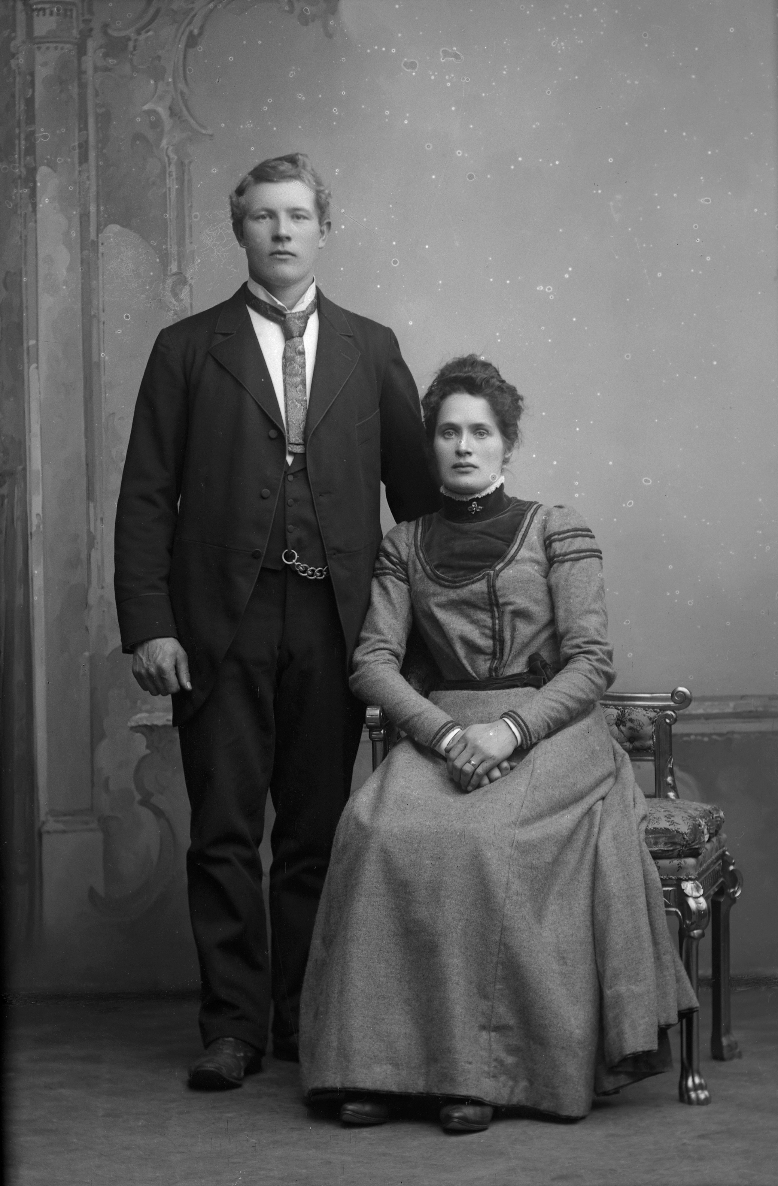Beskrivning: Porträtt i helfigur av herr Halldén med fru. Frun sittande i stol.
