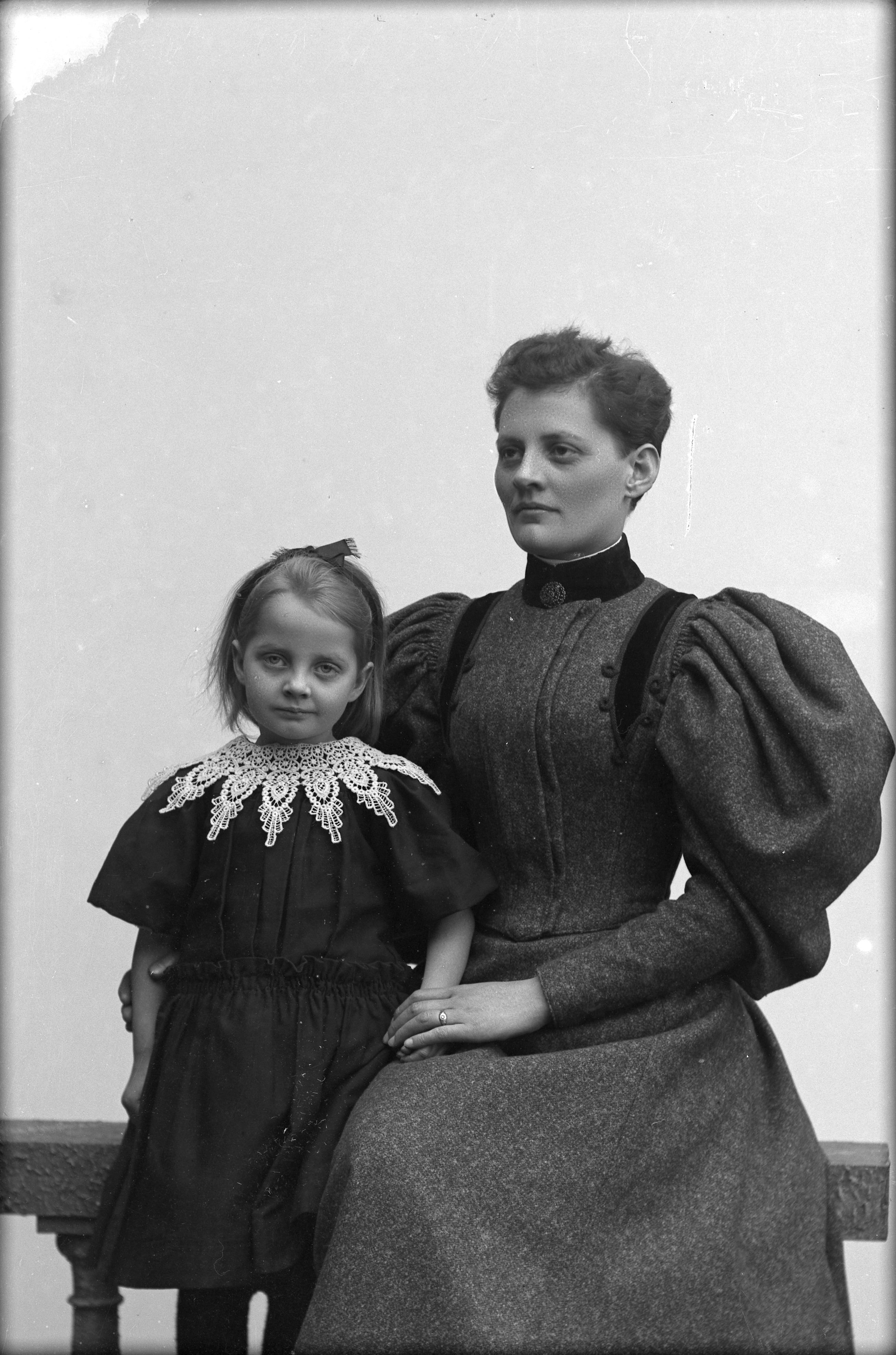 Beskrivning: Porträtt i helfigur av fröken Jonsson och Elvira Jonsson.
