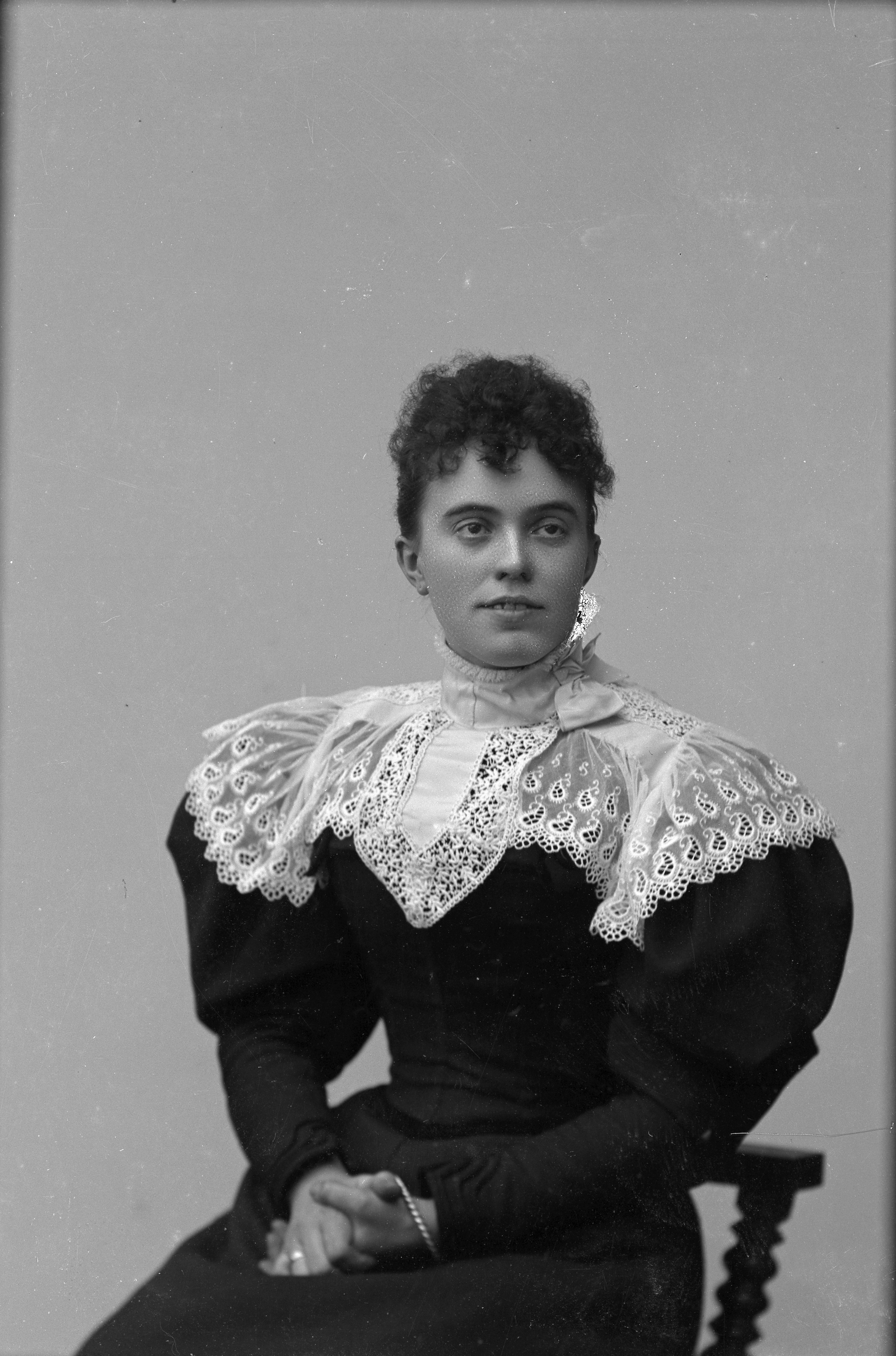 Beskrivning: Porträtt i halvfigur av fru /fröken Schmidt.
