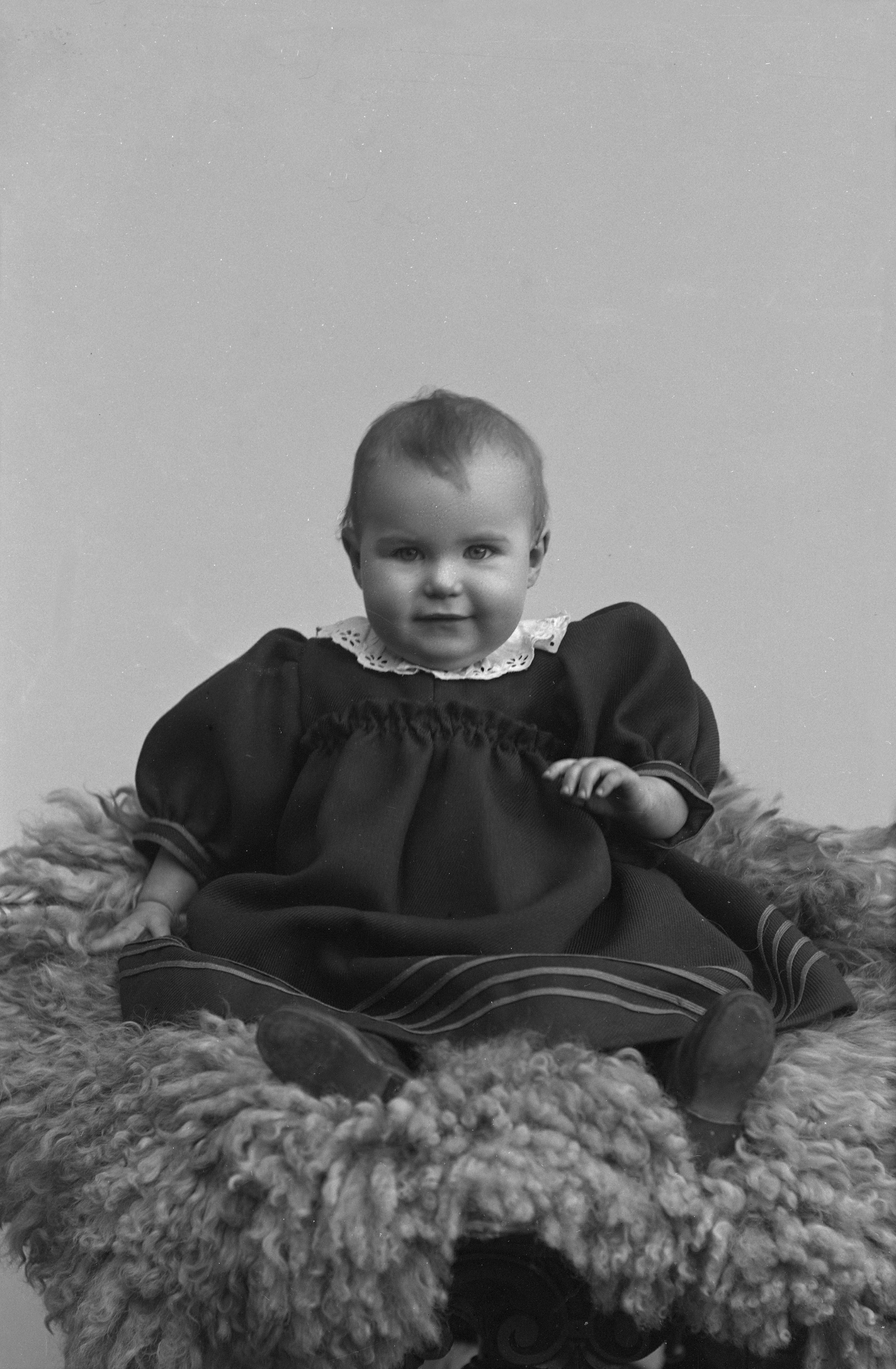 Porträtt i helfigur av fru Lundholms dotter, sittande på fäll.