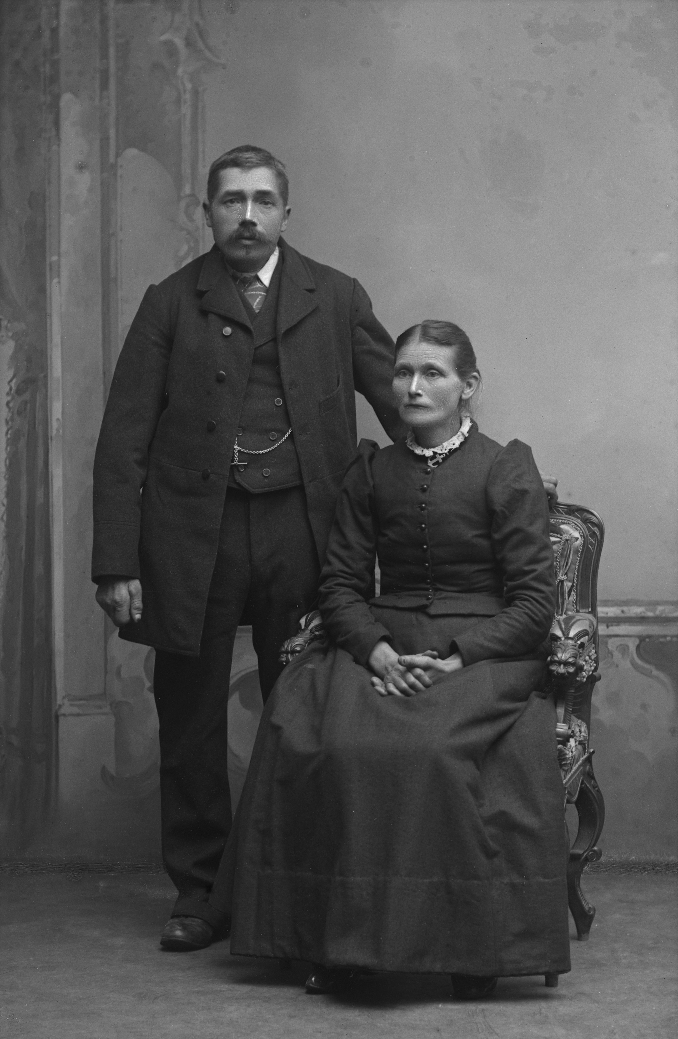 Beskrivning: Porträtt i helfigur av Magnus Pålsson med fru. Frun sittande i stol.