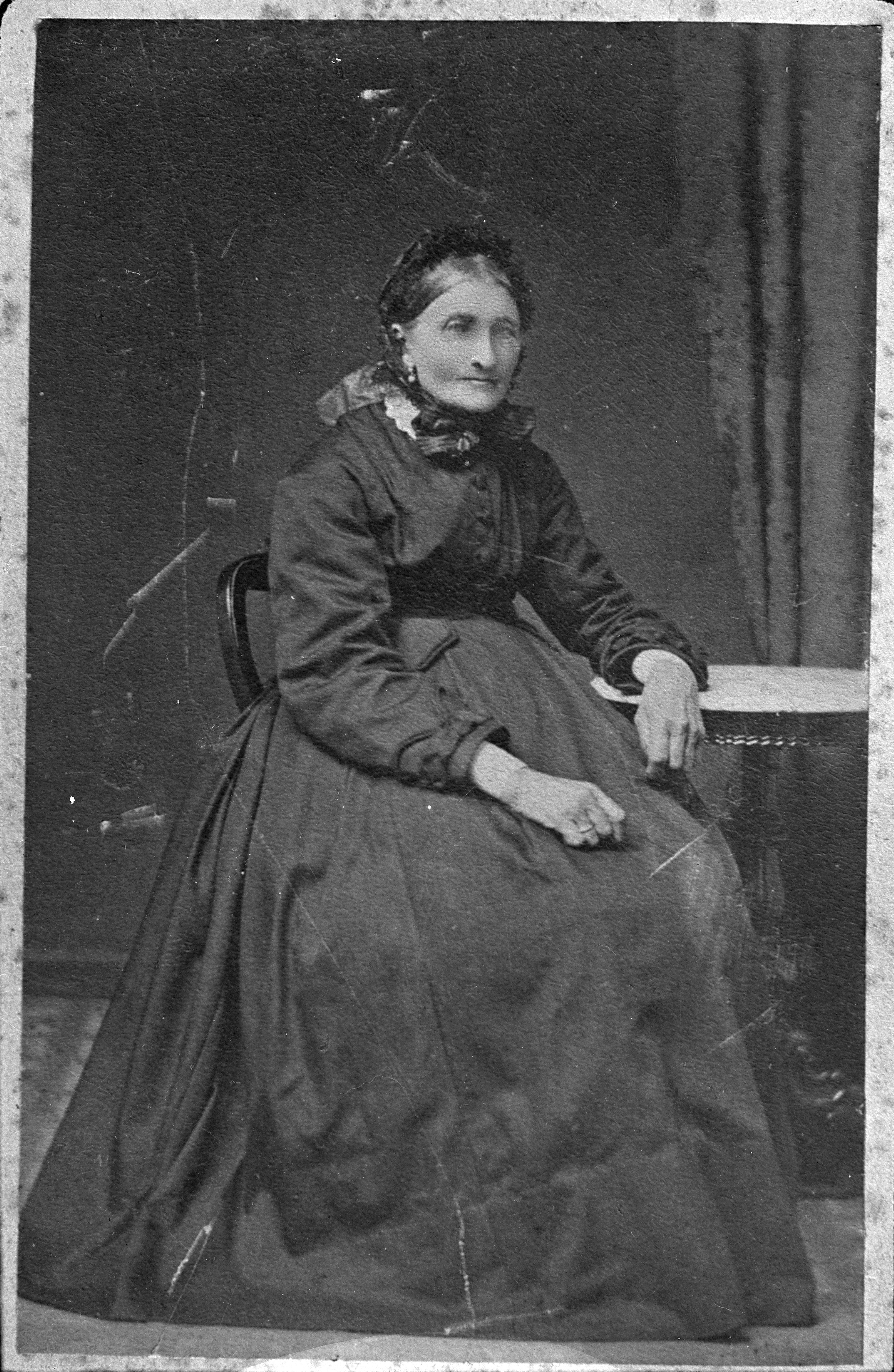 Porträtt i helfigur av fru Jönsson, sittande vid bord.