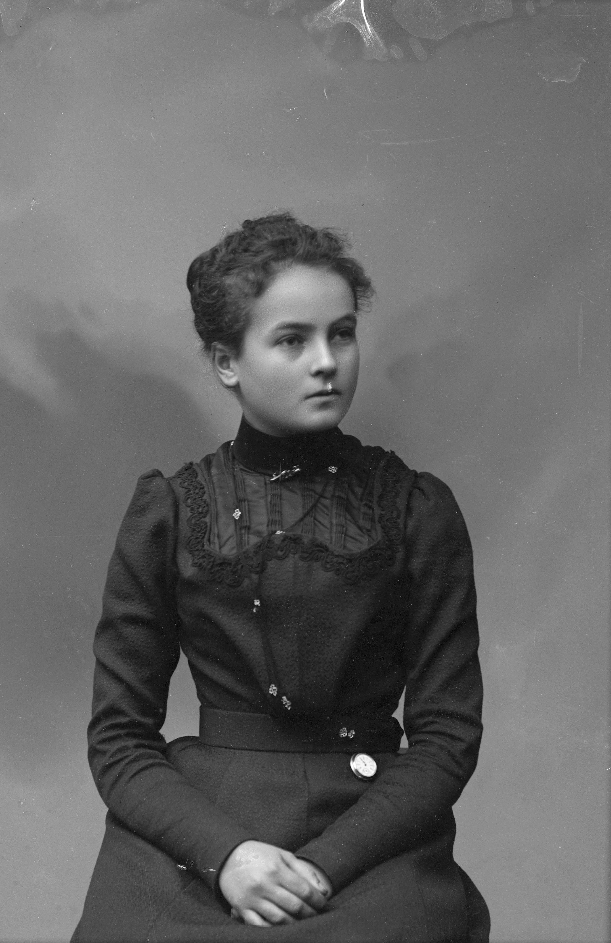 Beskrivning: Porträtt i halvfigur av Annie Falk.