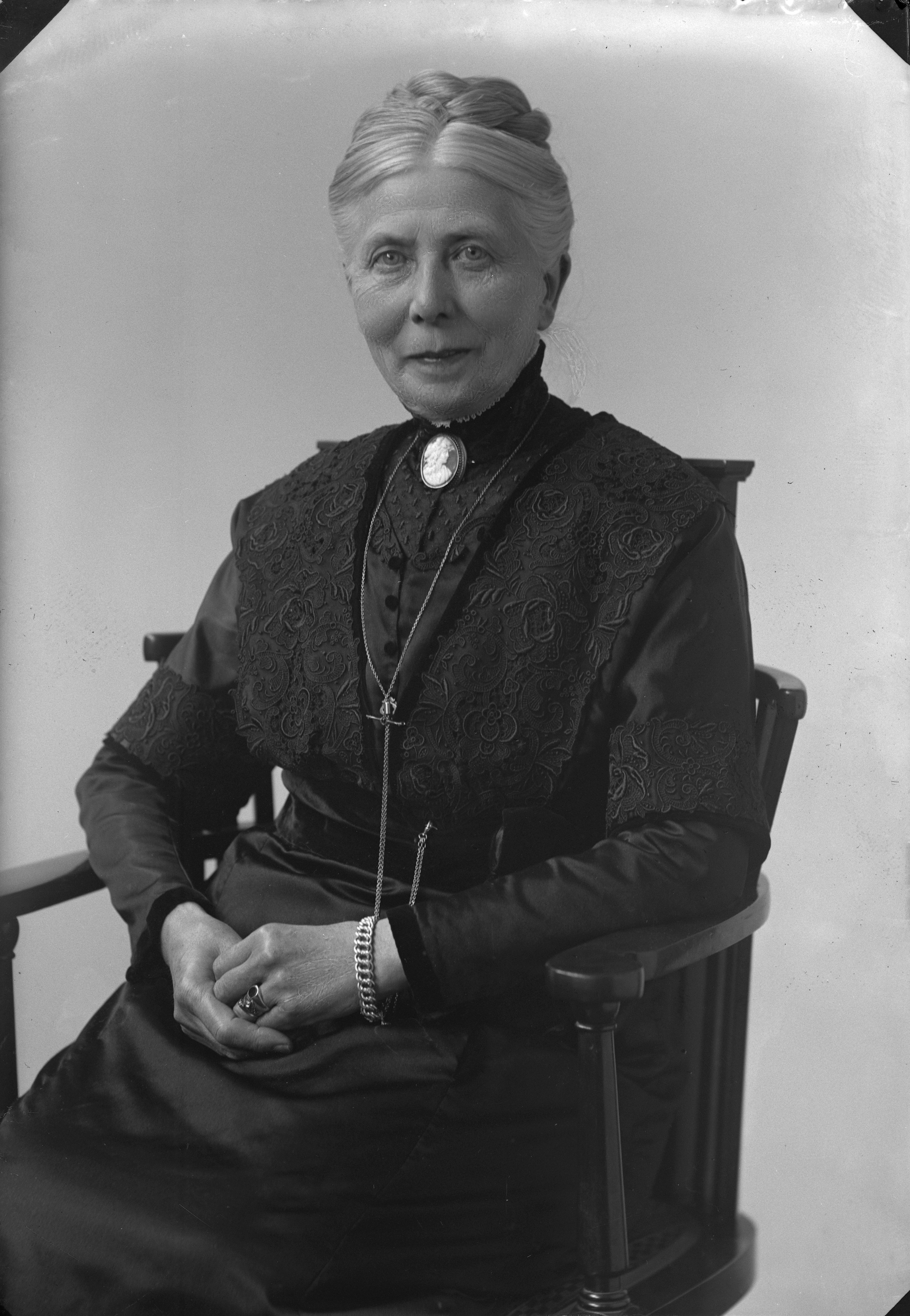 Porträtt i helfigur av fröken Gaugert, sittande i stol.