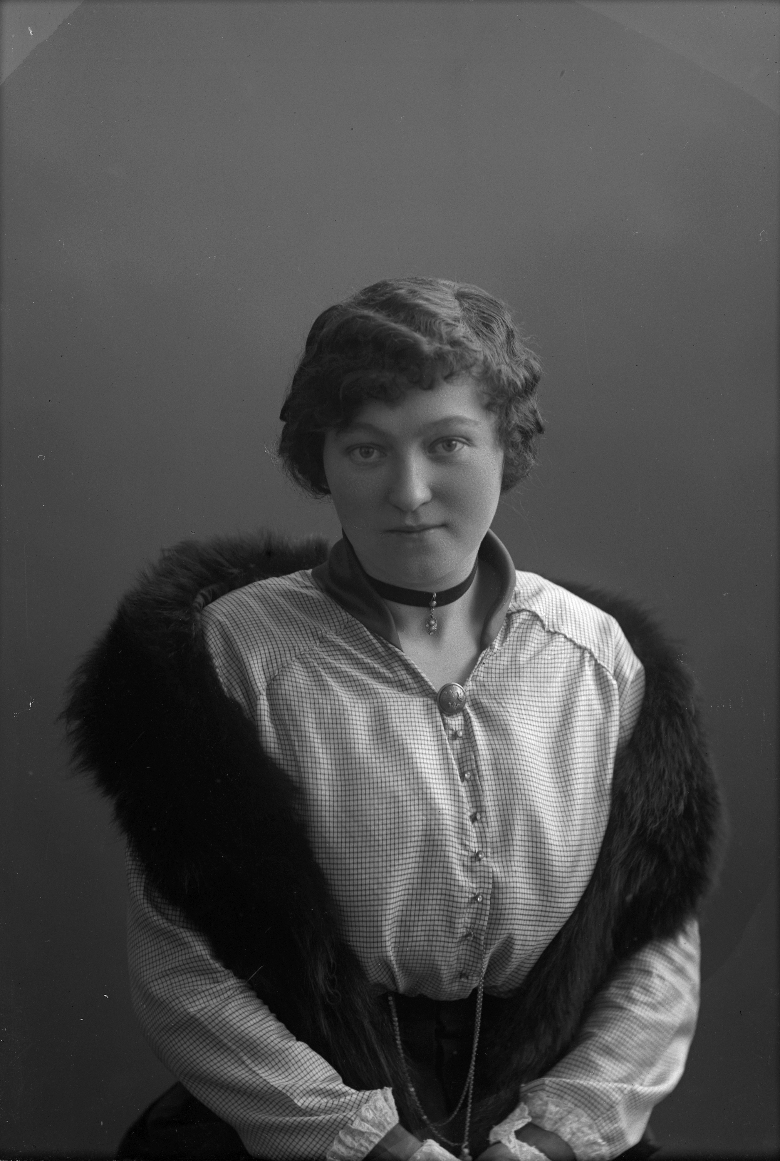 Beskrivning: Porträtt i halvfigur av O. Persson med päls runt halsen.