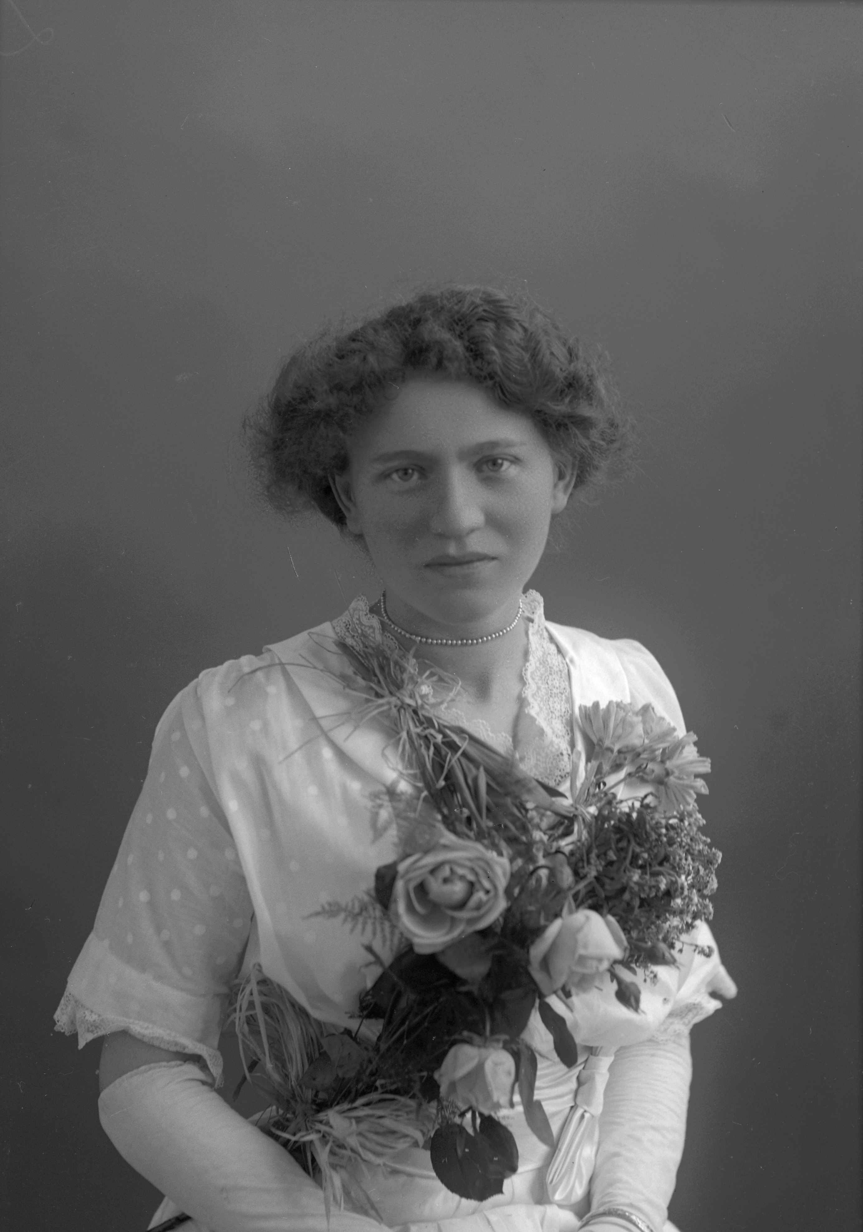 Beskrivning: Porträtt i halvfigur av Ebba Bromo med blomster på bröstet.