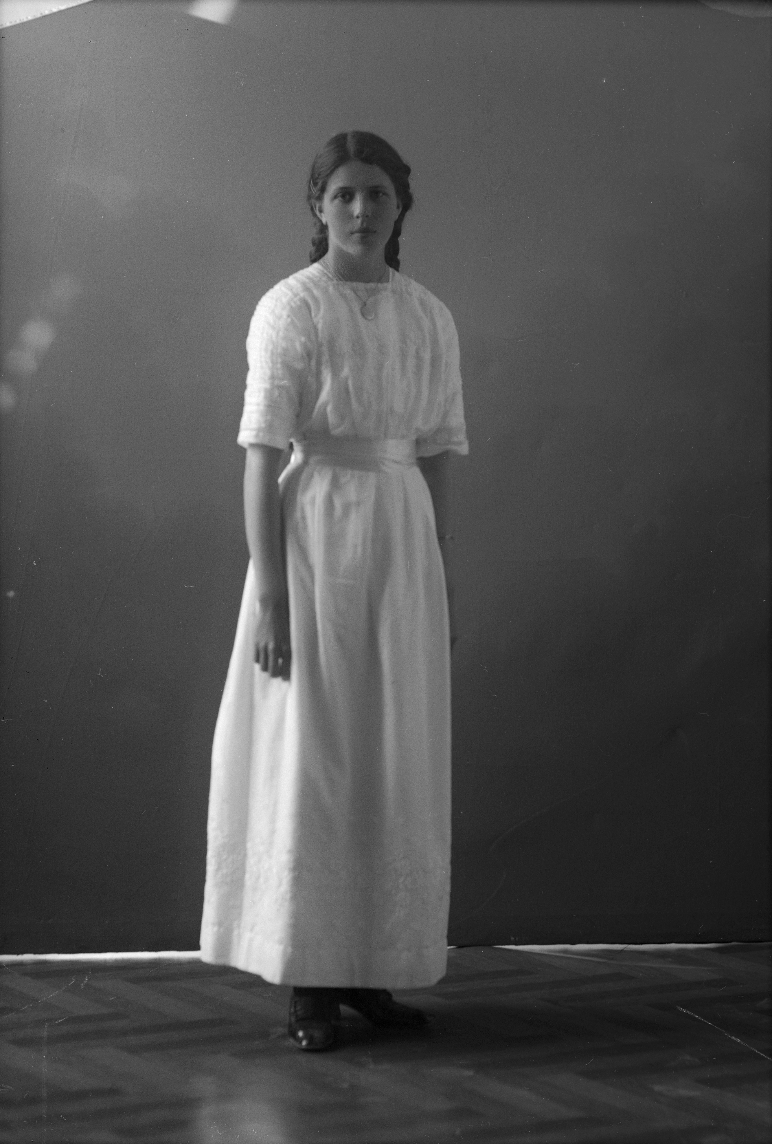Beskrivning: Porträtt i helfigur av Herta Jönsson.