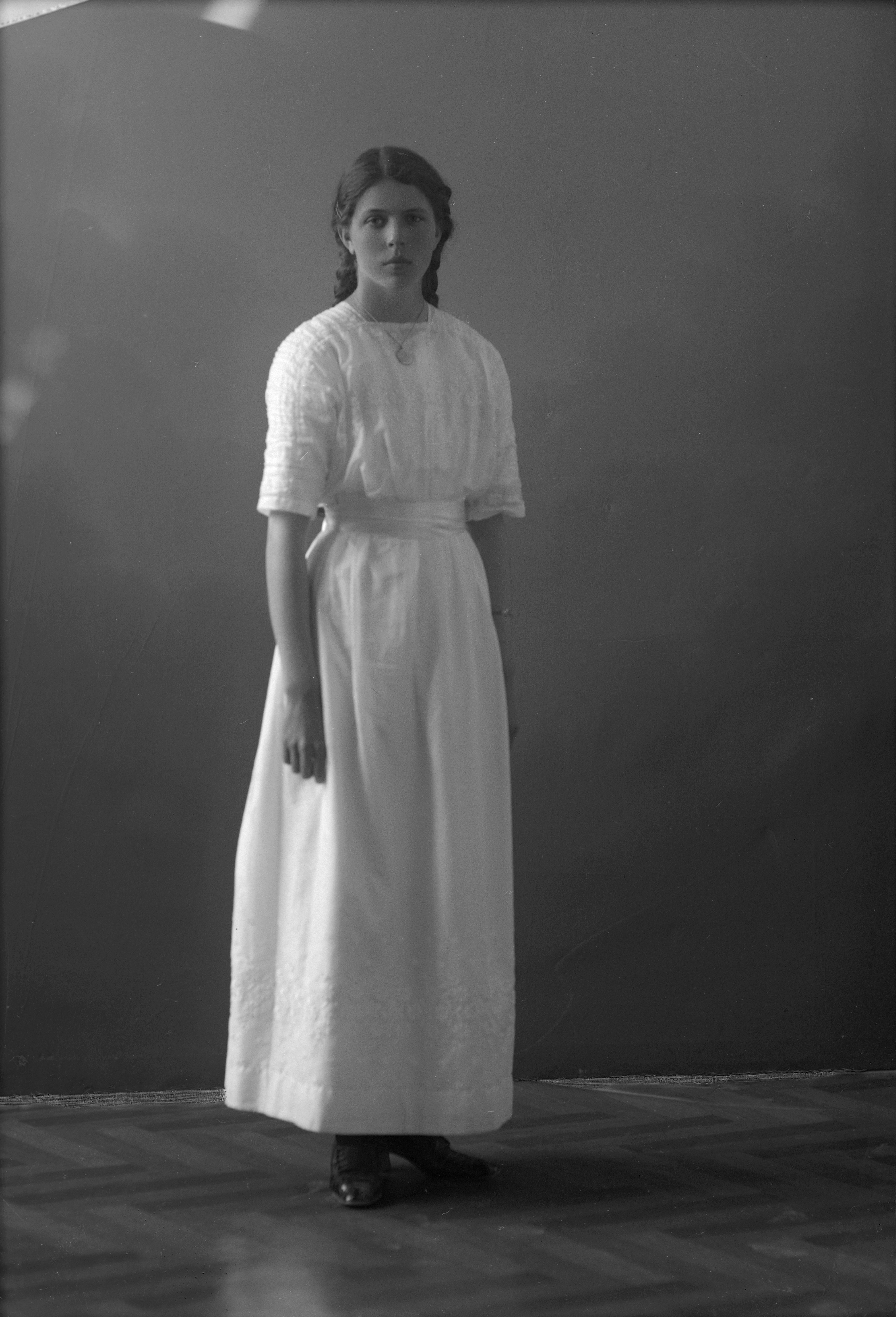 Beskrivning: Porträtt i helfigur av Herta Jönsson.