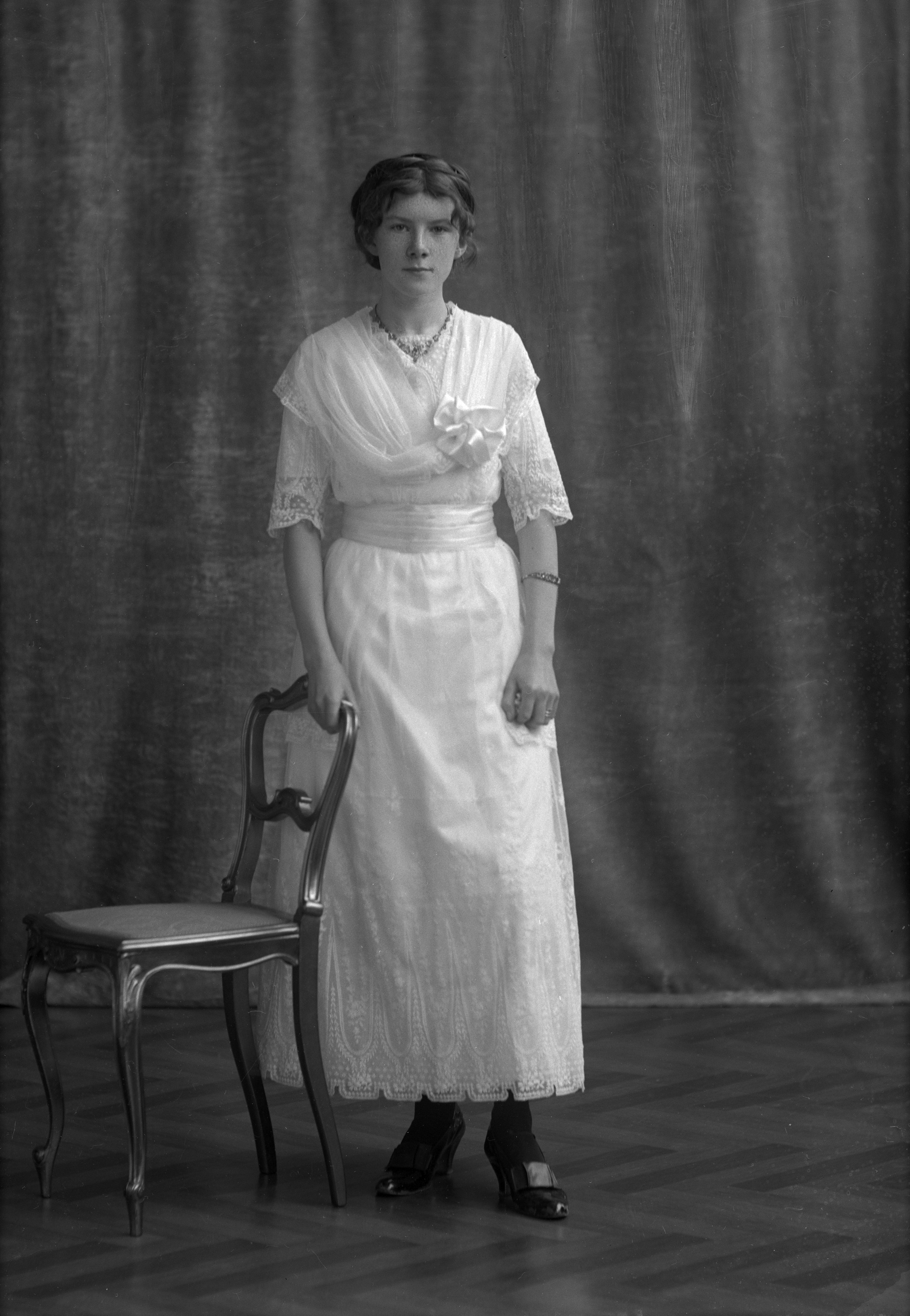 Porträtt i helfigur av Signe Jönsson, stående vid stol (i nyrokoko).