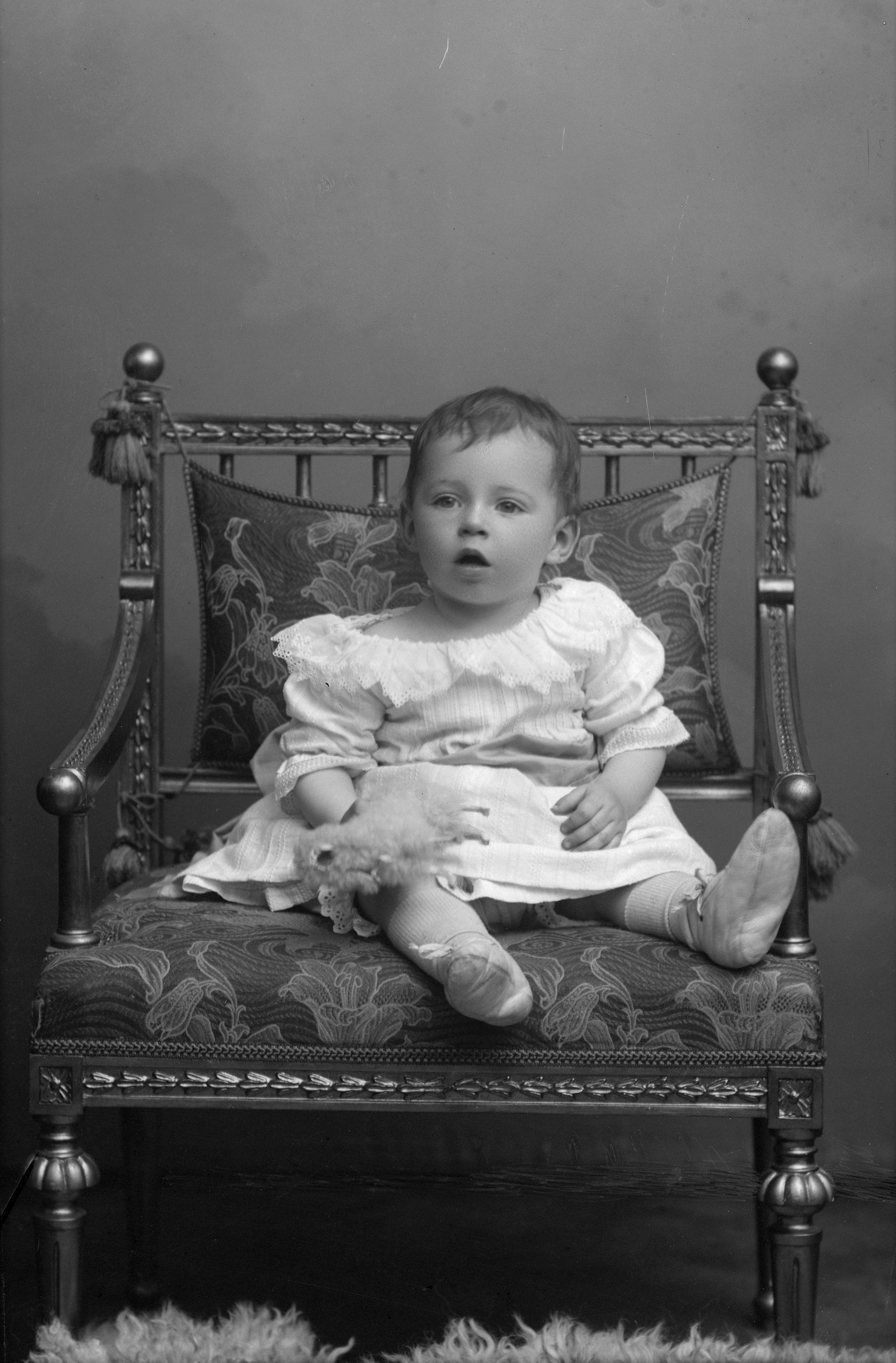 Beskrivning: Porträtt i helfigur av Rosencrantz barn, sittande i stol.