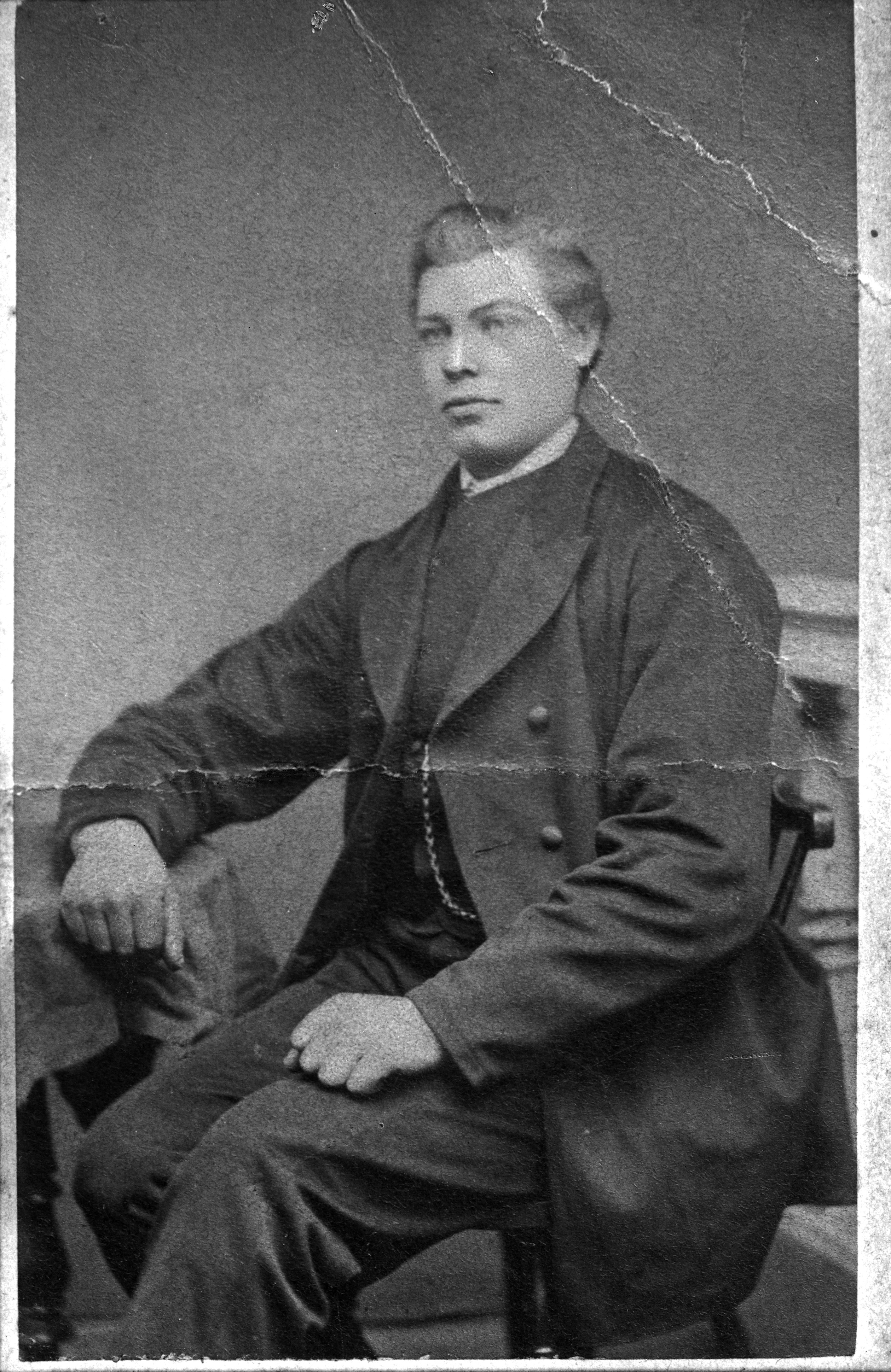 Porträtt i helfigur av herr Cederquist, sittande i stol.