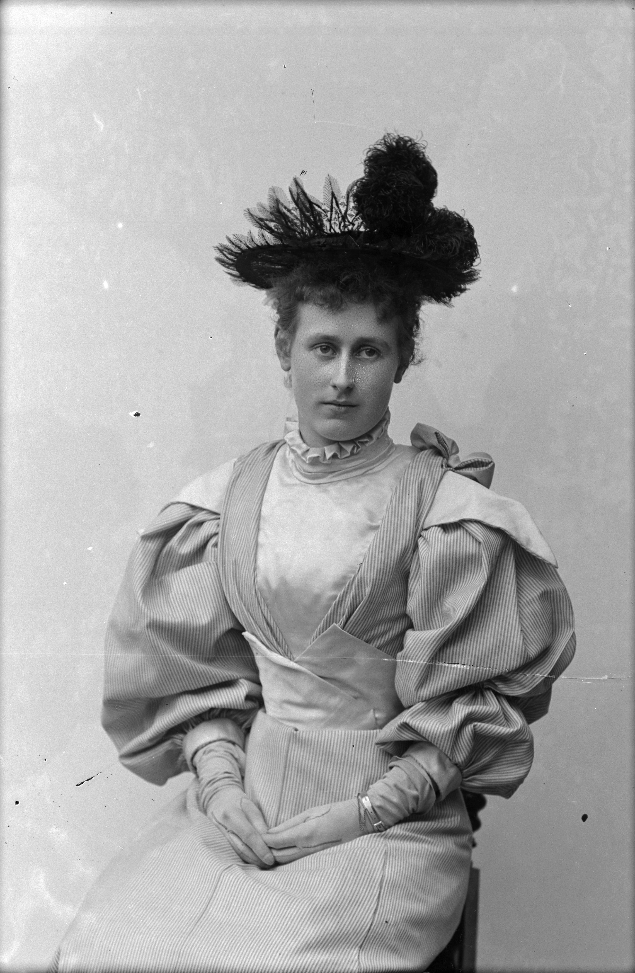 Porträtt i halvfigur av fröken Malmros, iklädd hatt.