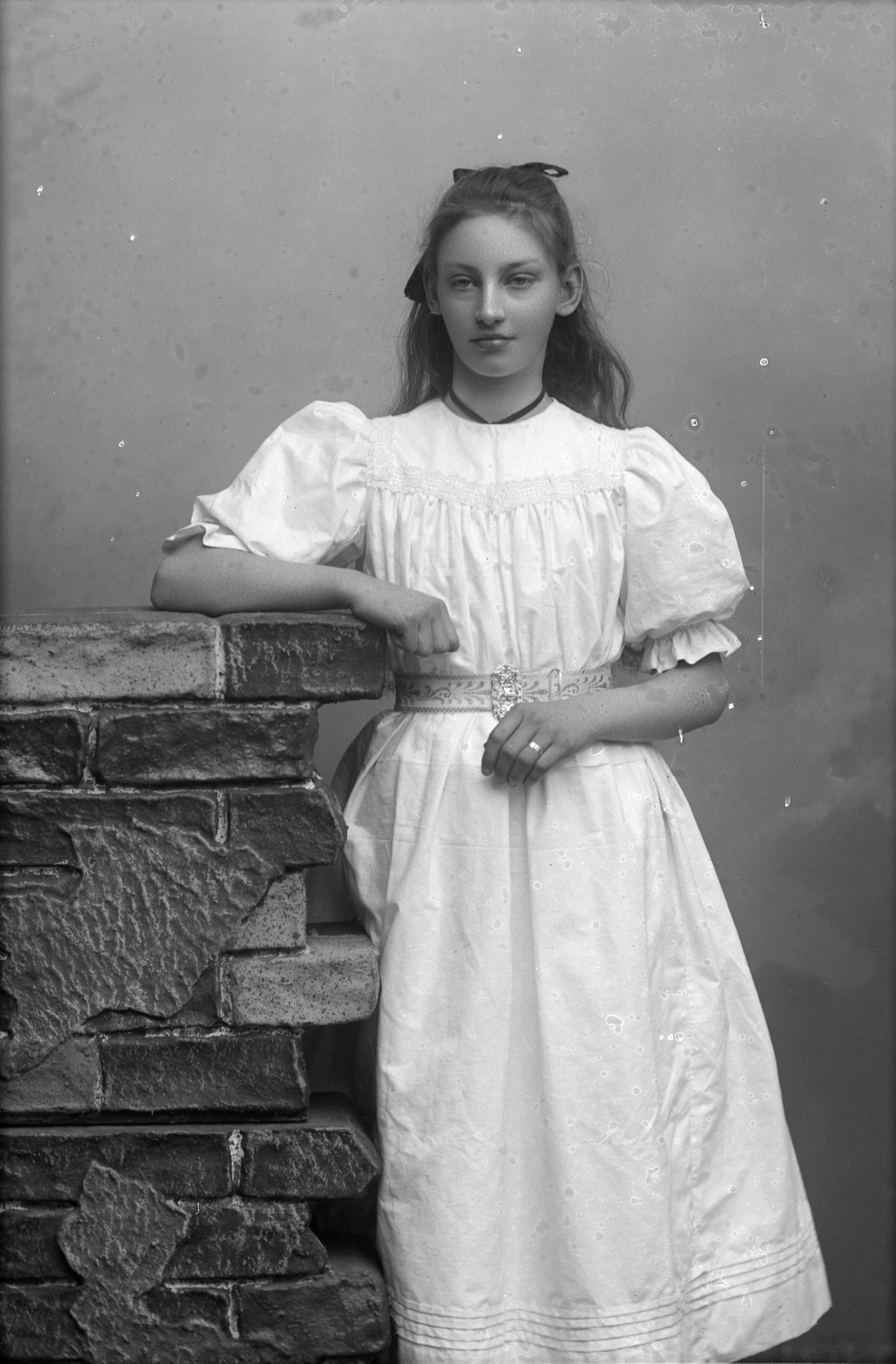 Porträtt i helfigur av Holmquists dotter, stående vid tegelmur.
