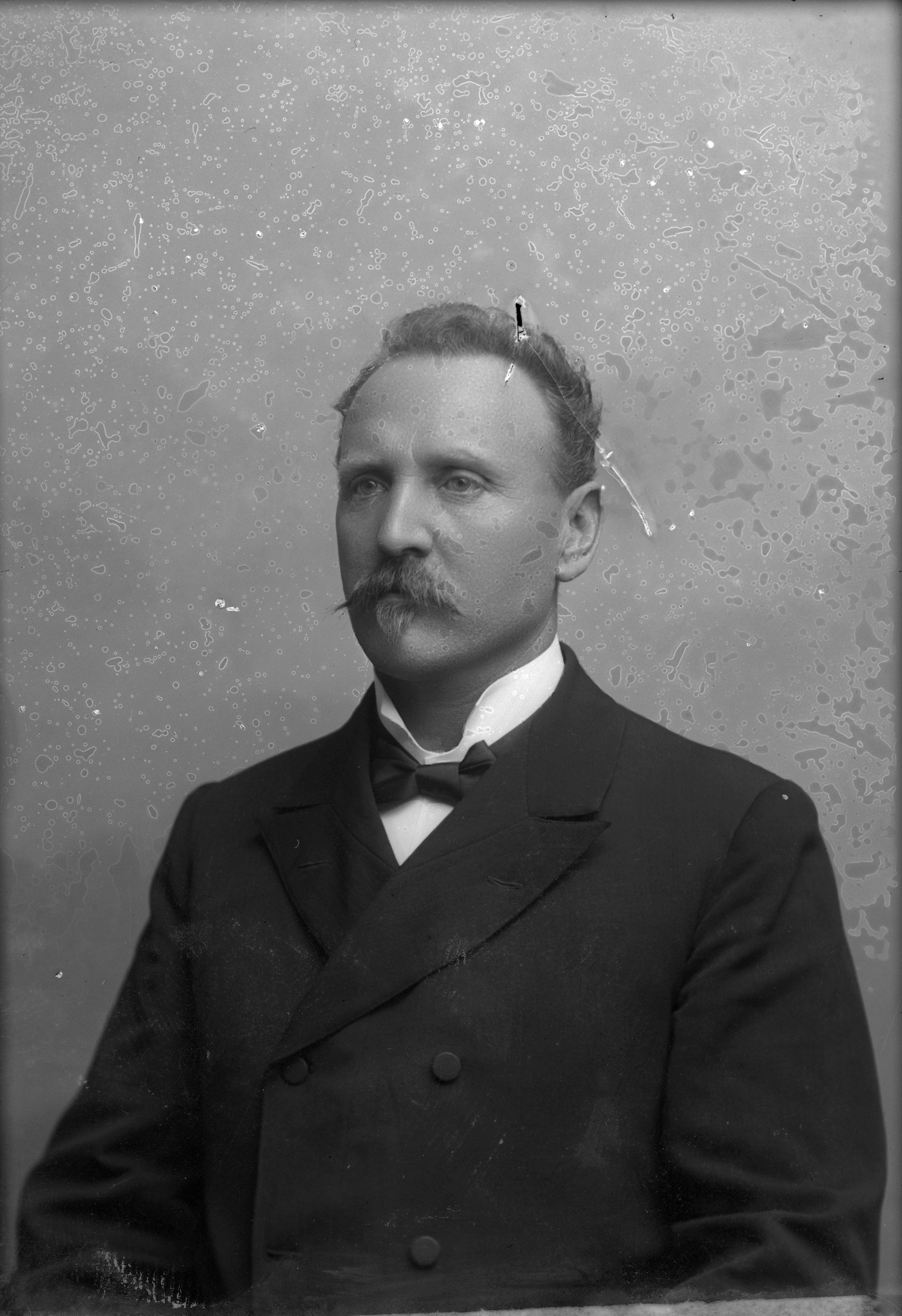 Beskrivning: Porträtt i halvfigur av August Karlsson.