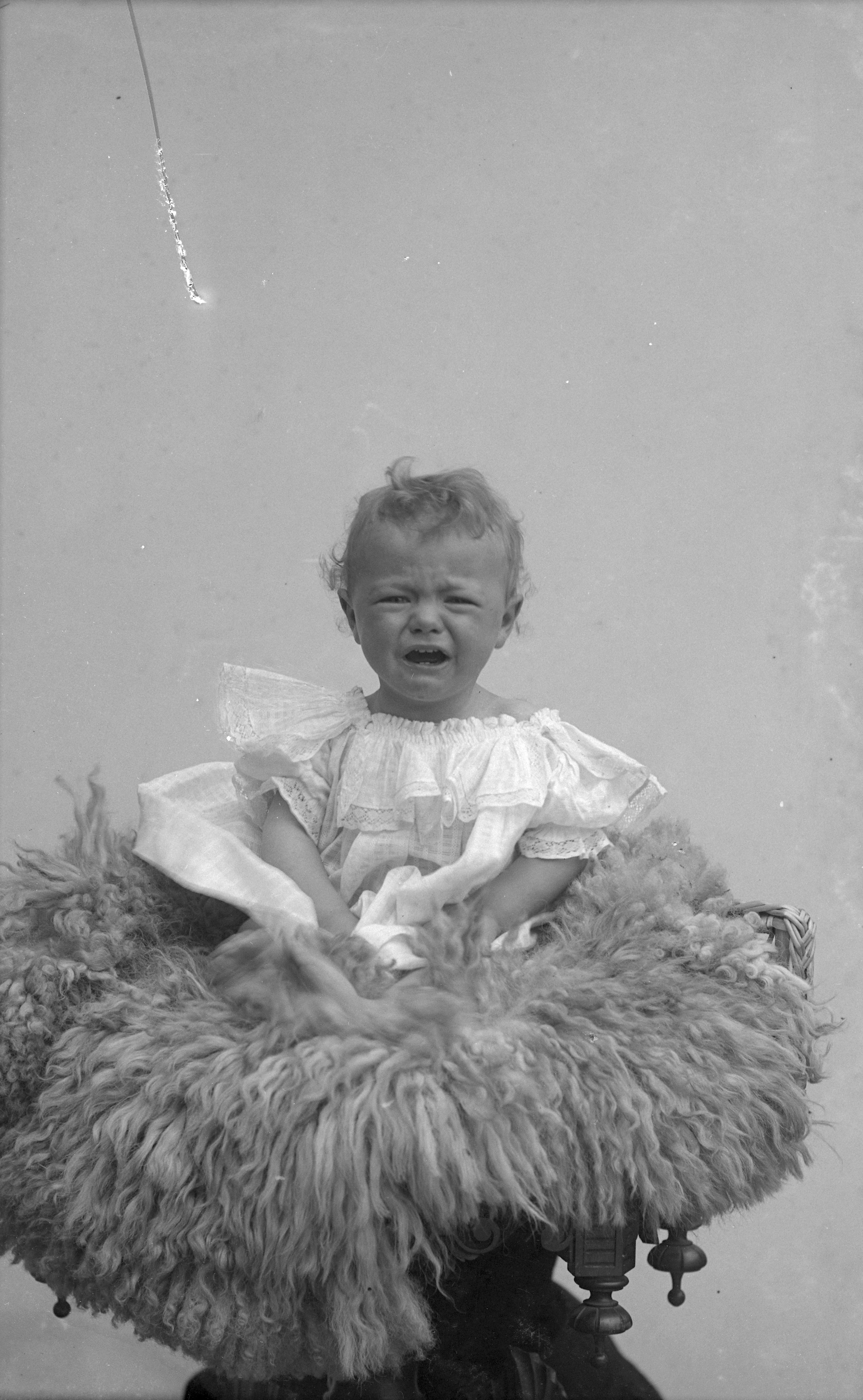 Porträtt i helfigur av fru Holmströms son, sittande på fäll.