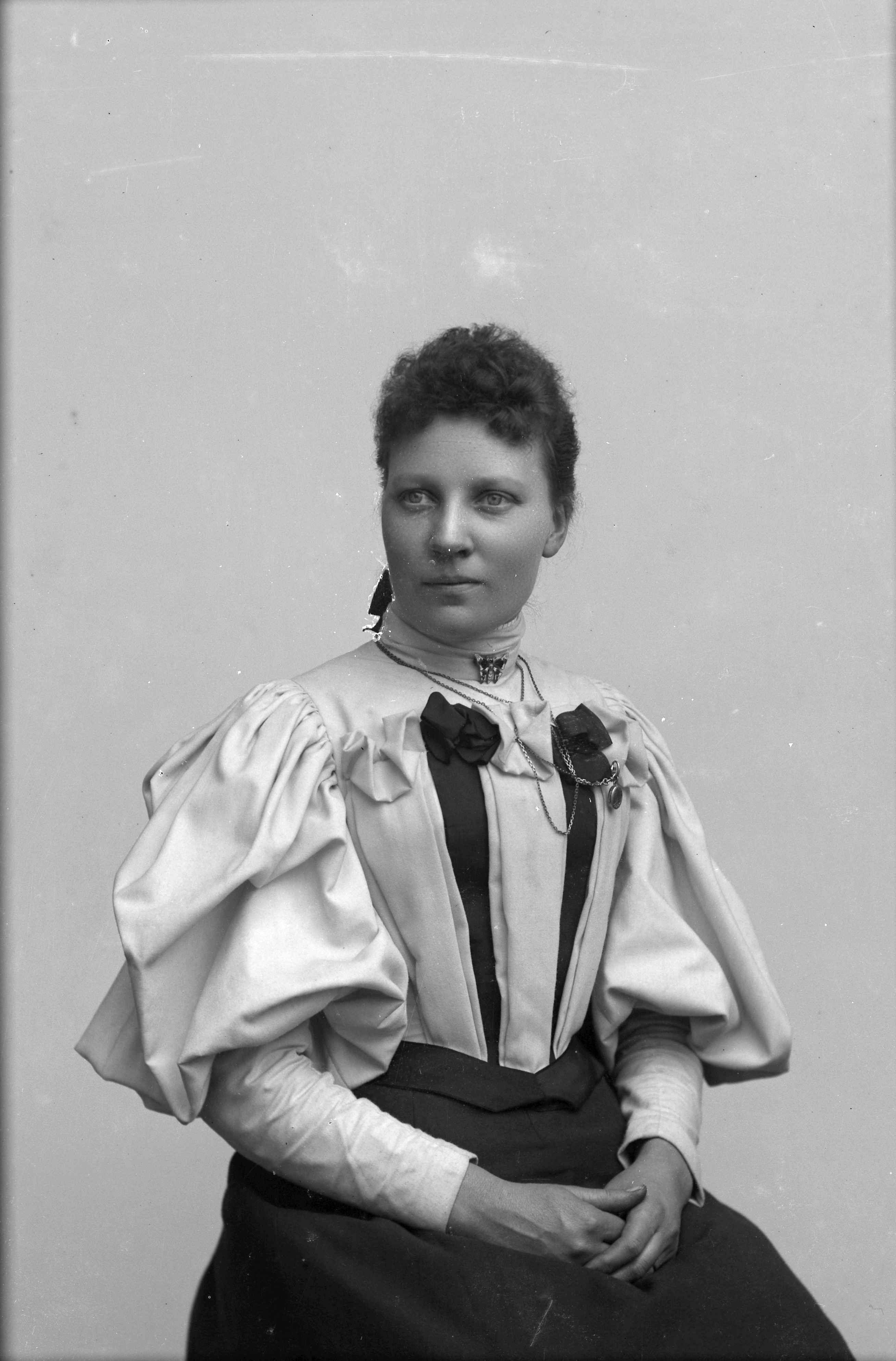 Beskrivning: Porträtt i halvfigur av Nanny Karlsson.