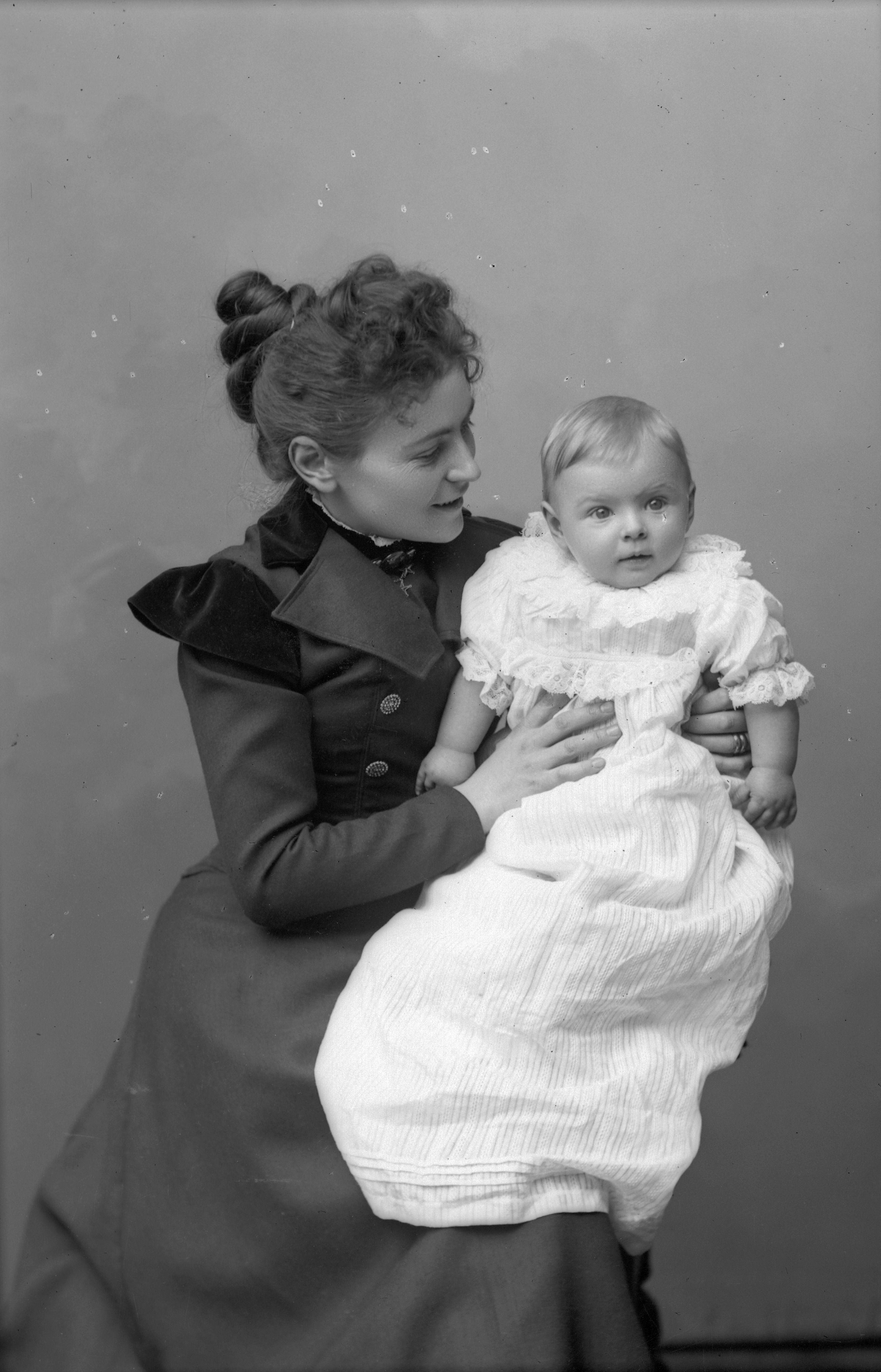 Porträtt i helfigur av fru (---), sittande med sitt barn i knät.