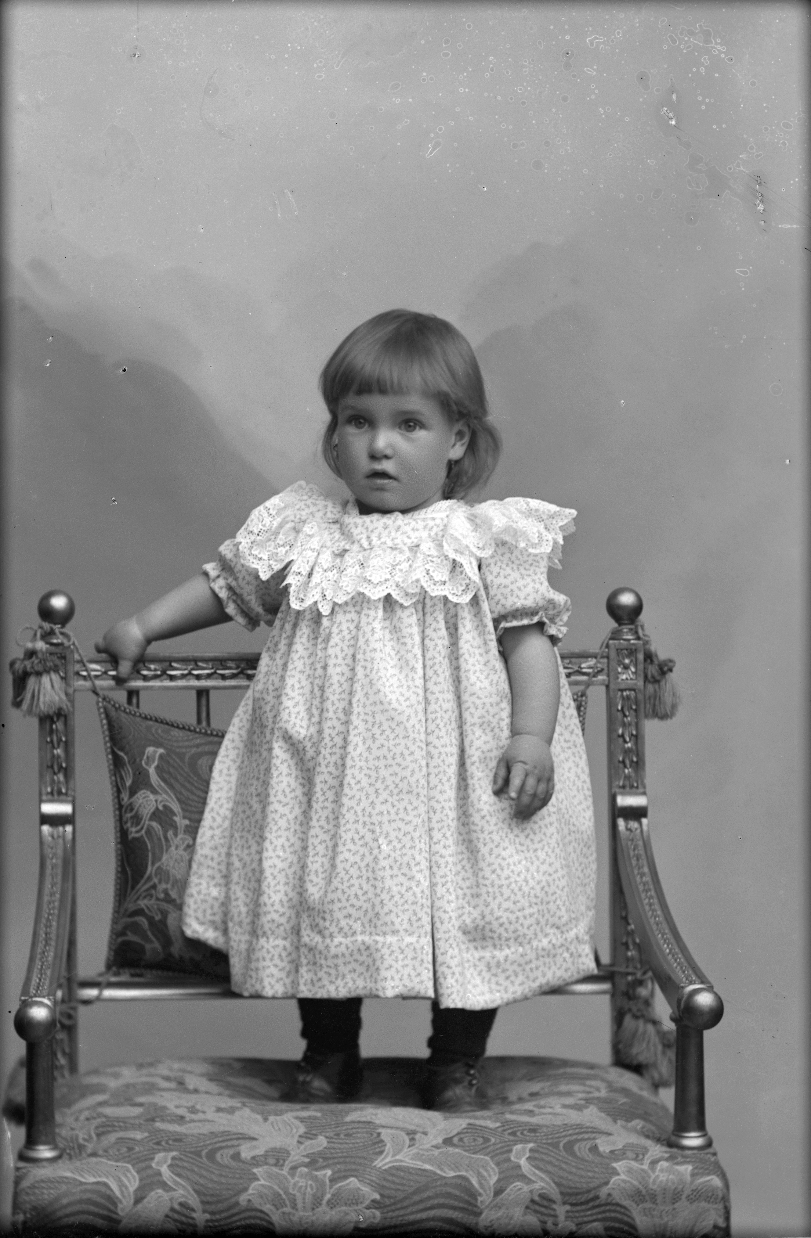 Porträtt i helfigur av Fries dotter, stående på stol.