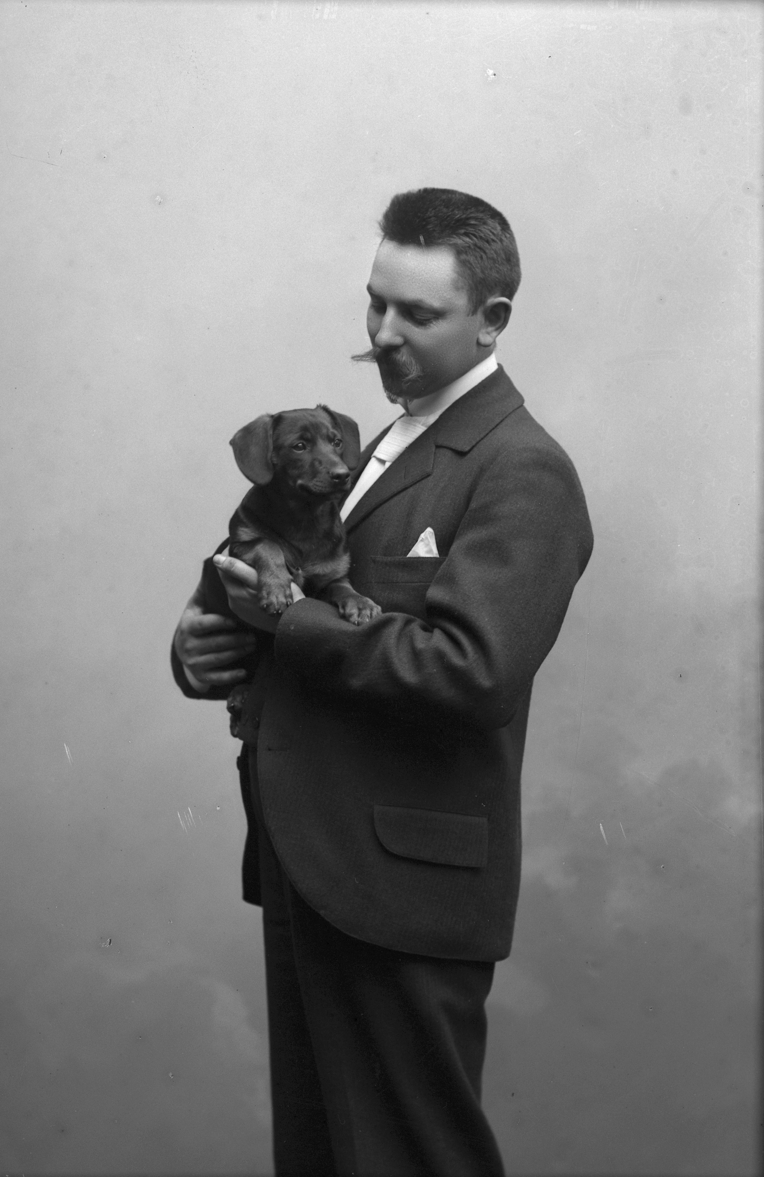 Porträtt i helfigur av herr Ekström, hållande hund i famnen.