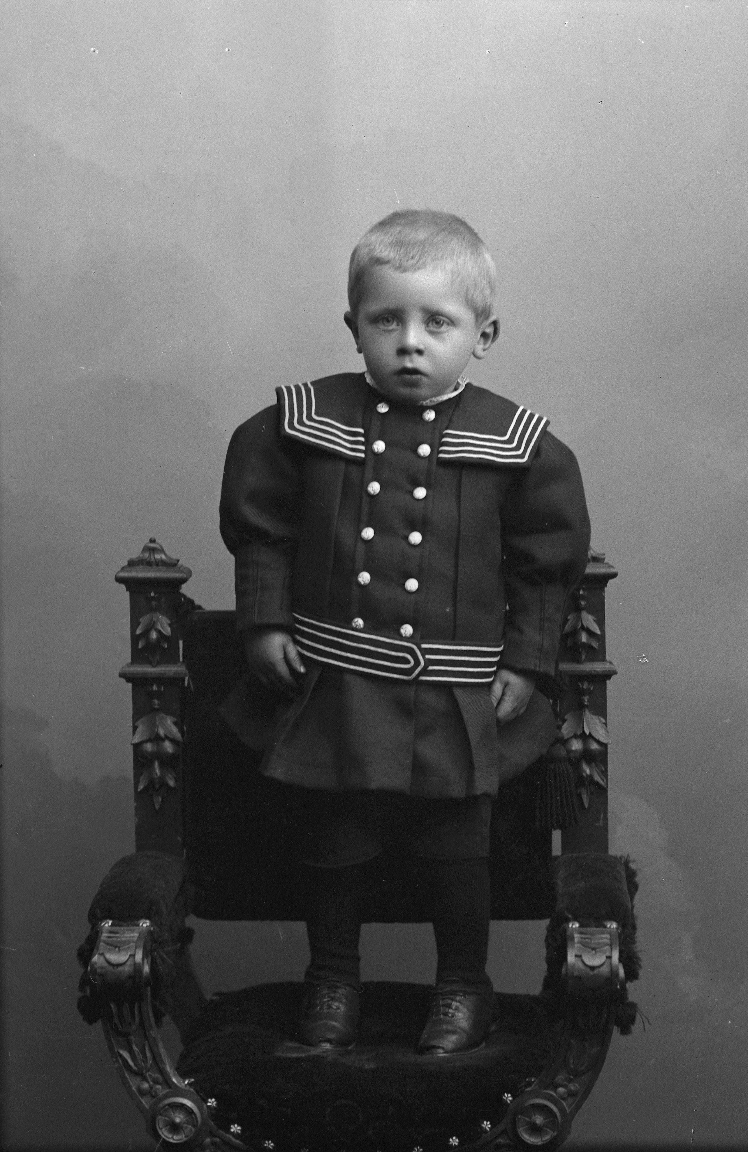 Porträtt i helfigur av herr Larssons son, iklädd sjömanskostym, stående på stol.