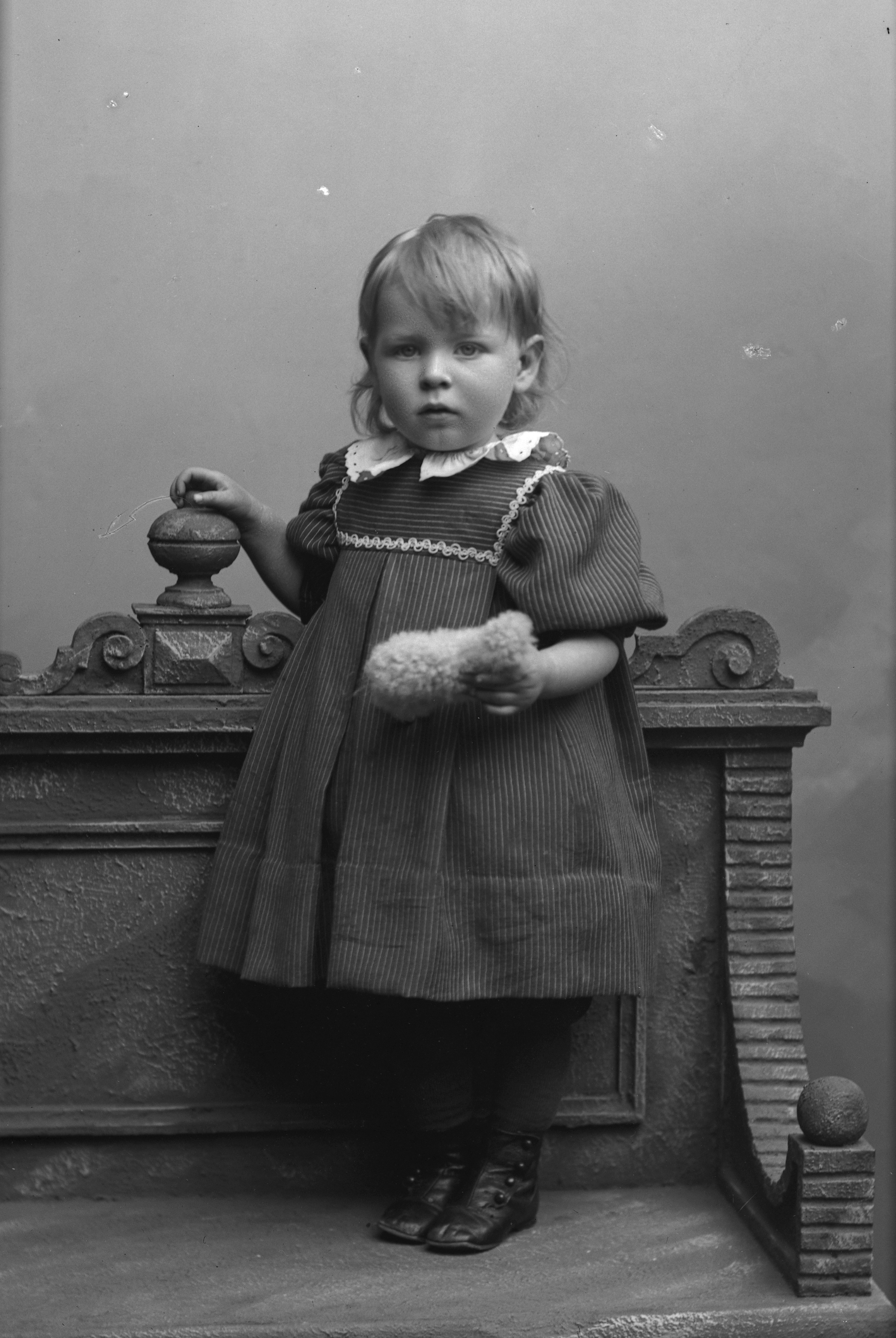 Porträtt i helfigur av herr Svenssons dotter, stående på bänk, med hund.