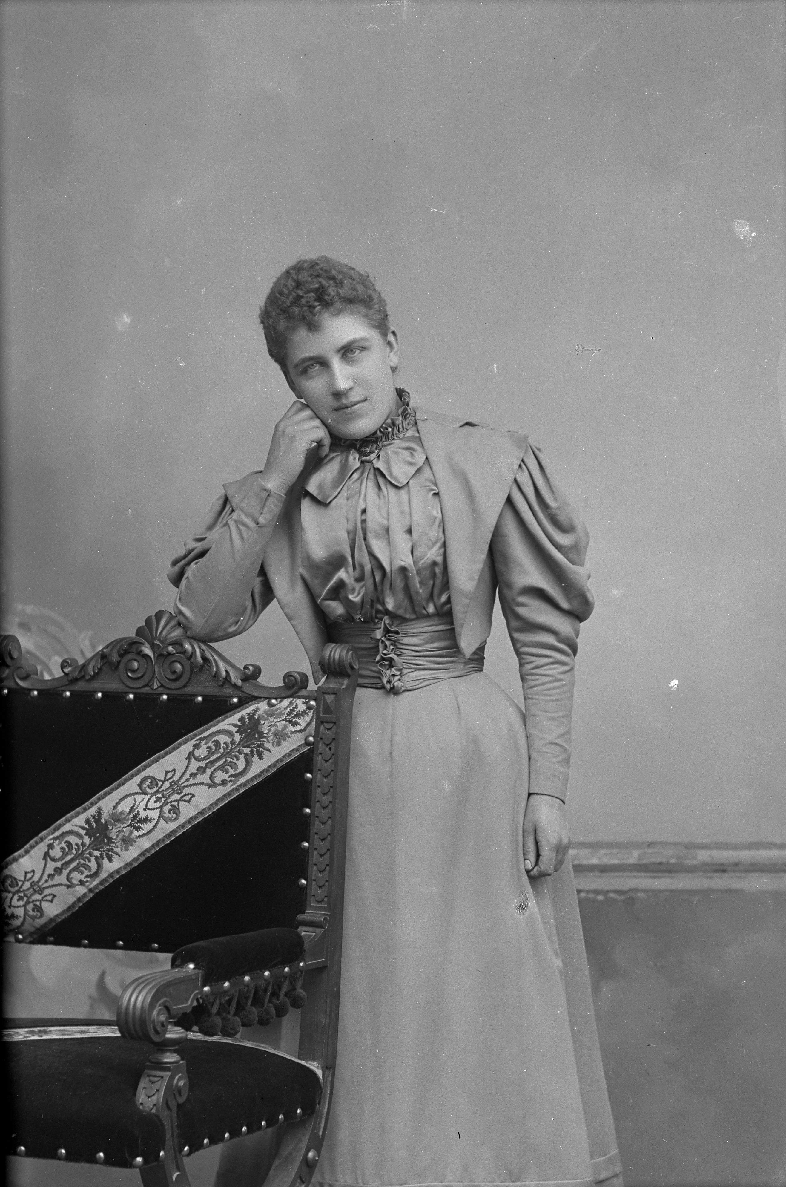 Porträtt i helfigur av Louise Bergström, stående vid stol.