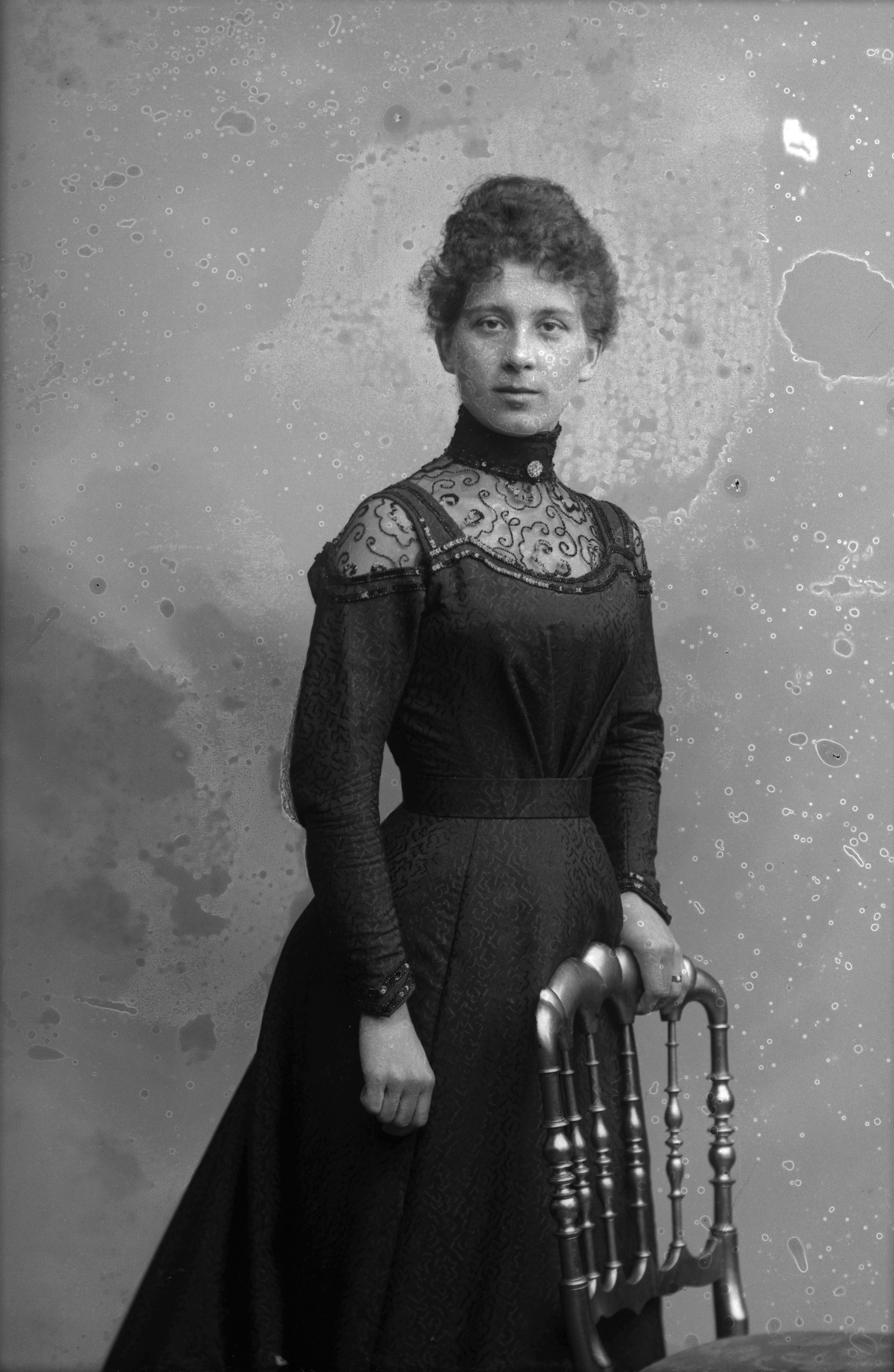Porträtt i helfigur av Ida Storm, stående vid stol.
