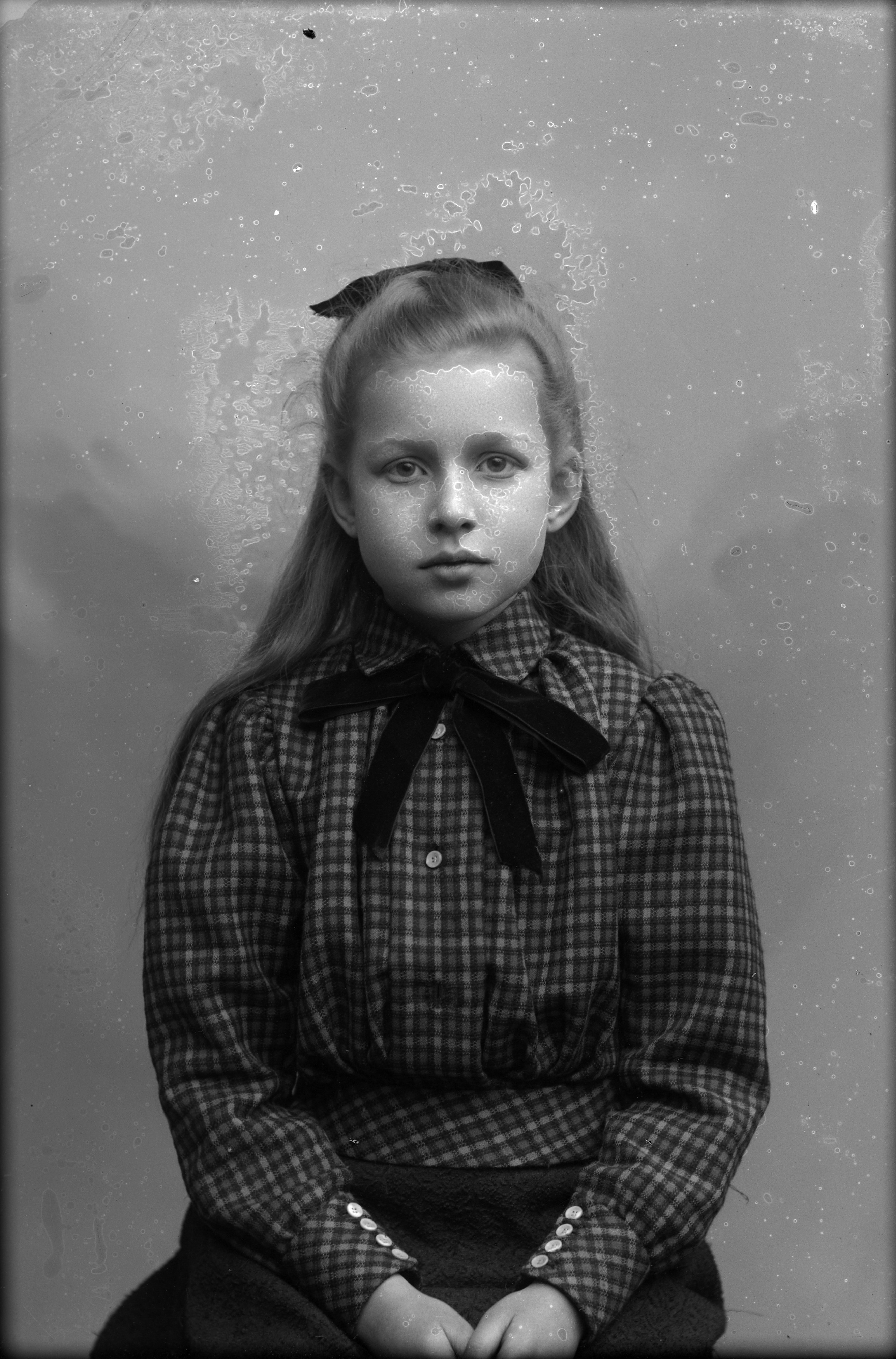 Beskrivning: Porträtt i halvfigur av Lisa Sederholm med rosett i håret.