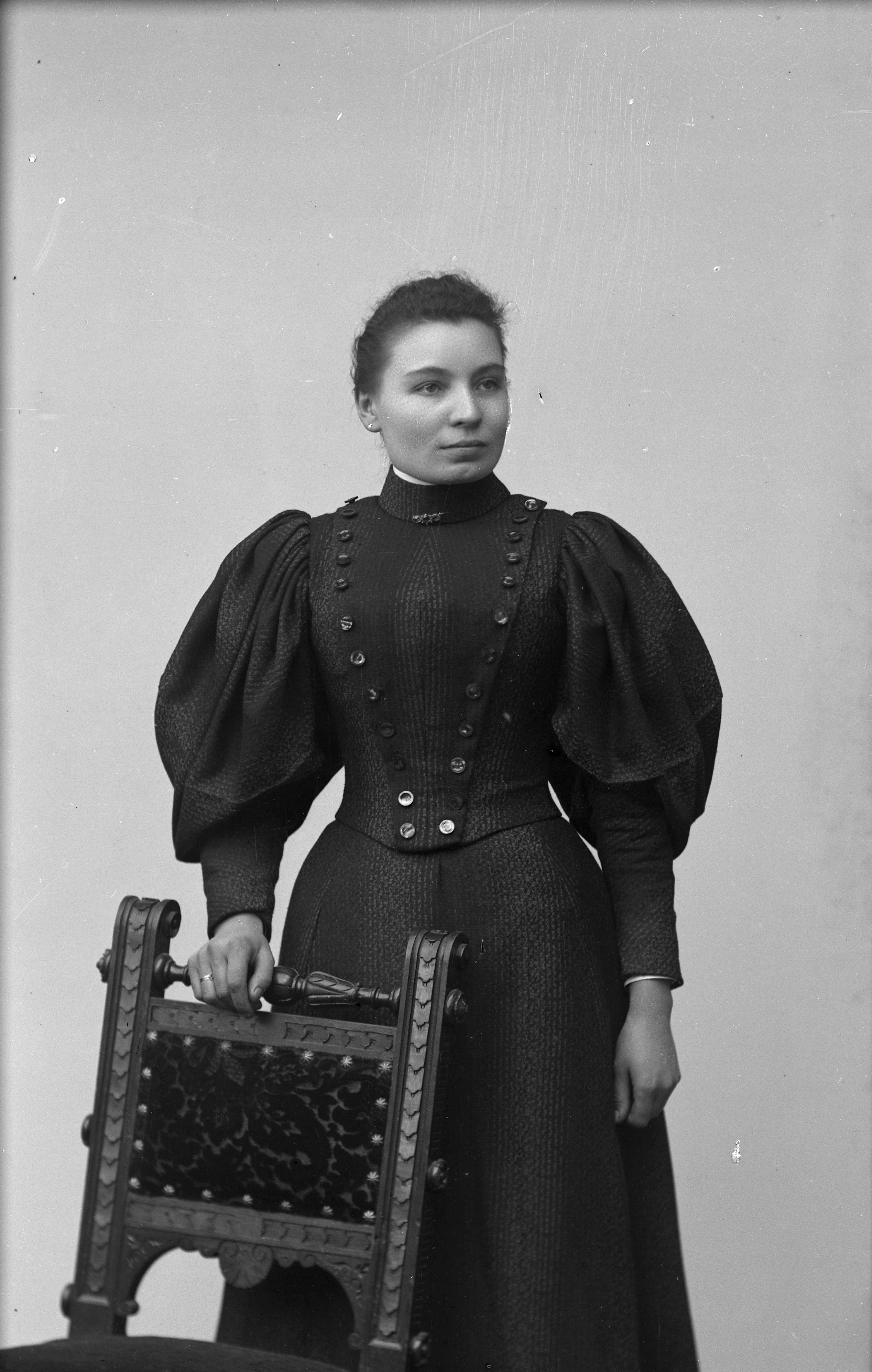 Porträtt i halvfigur av Maria Olsson, stående vid stol.