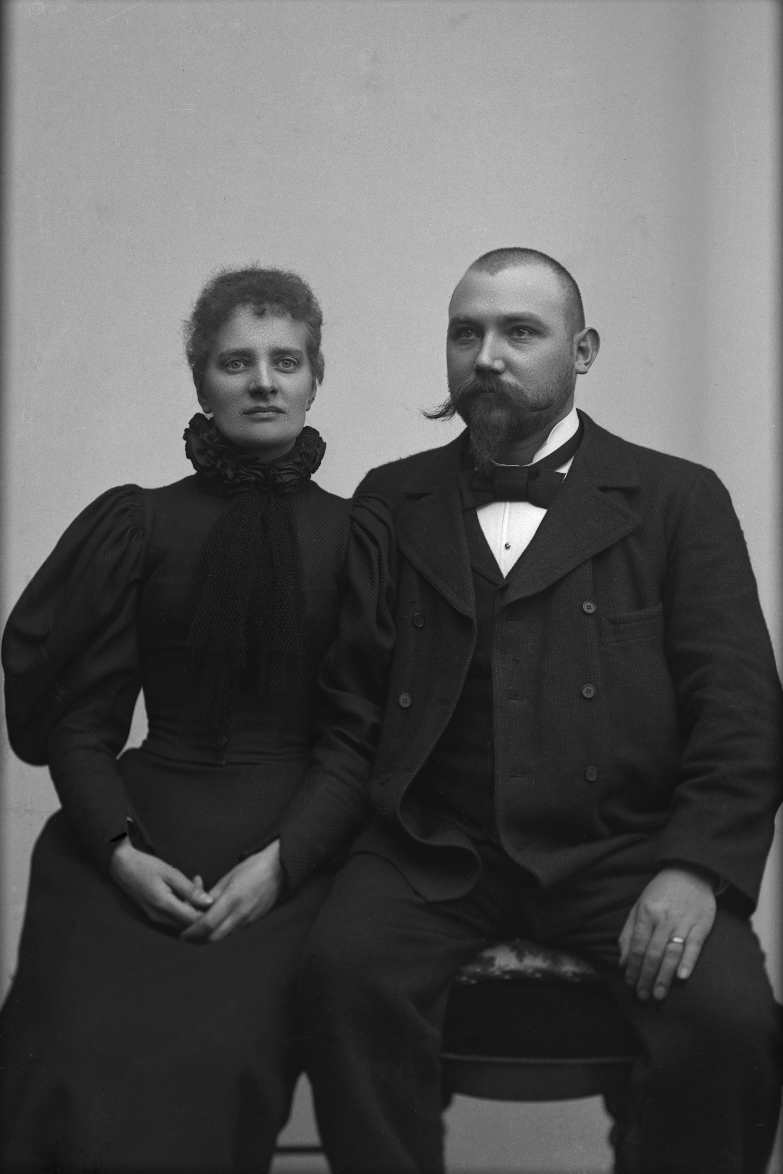 Porträtt i helfigur av fröken Enequist med okänd man, möjligen fästman.