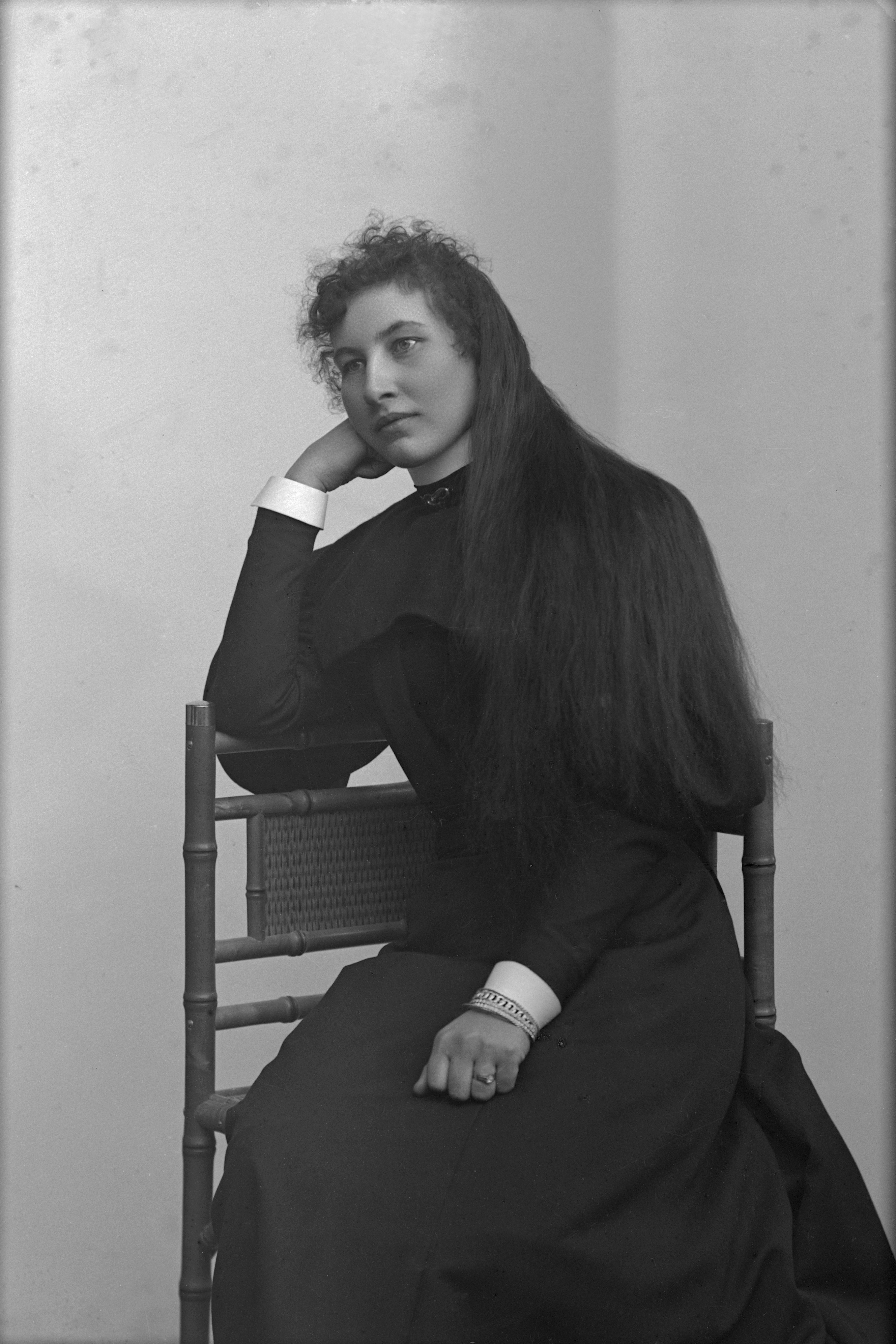 Porträtt i helfigur av fröken Ancarlo, sittande i stol.