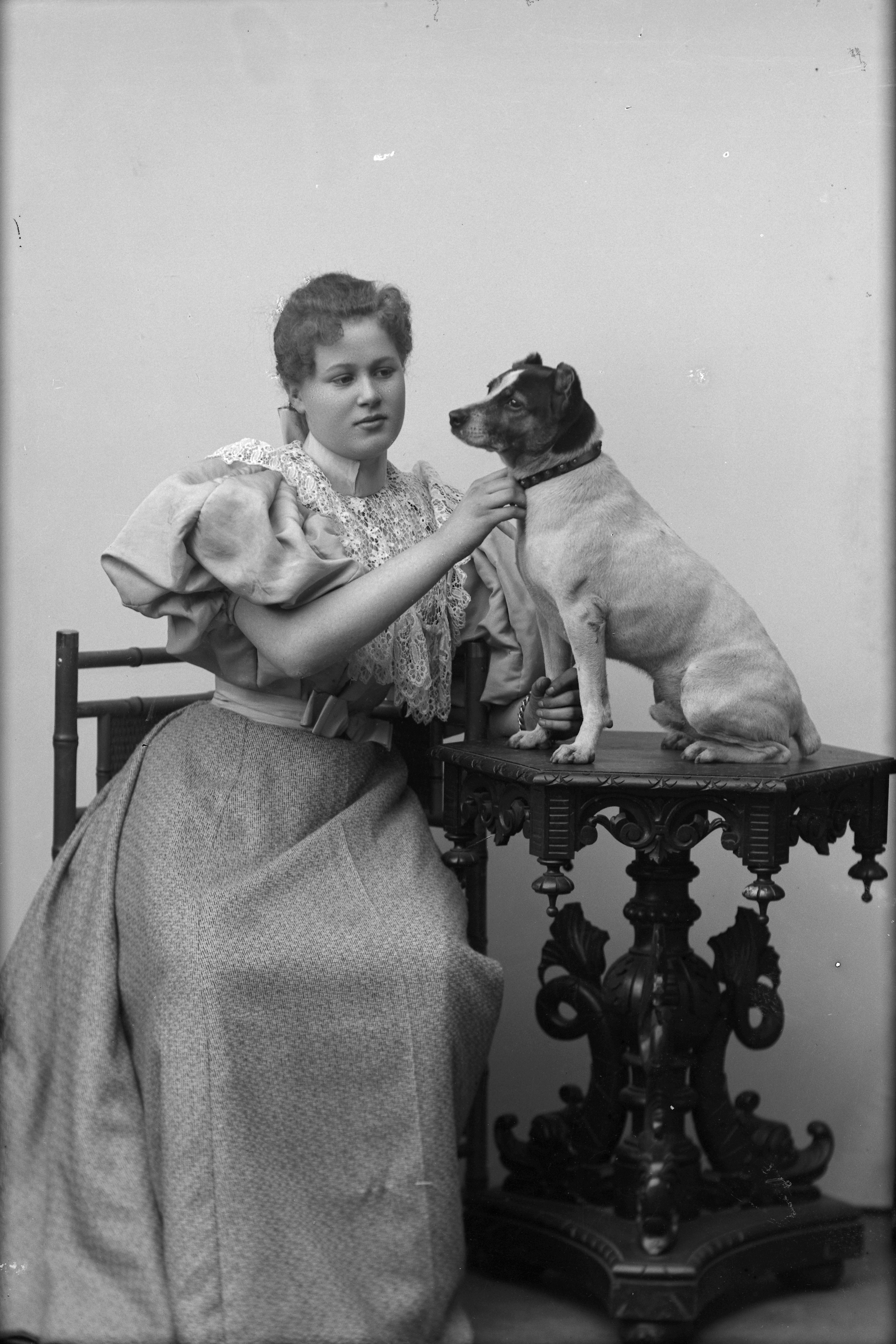 Porträtt i helfigur av fröken Möller, sittande i stol med hund, sittande på bord.