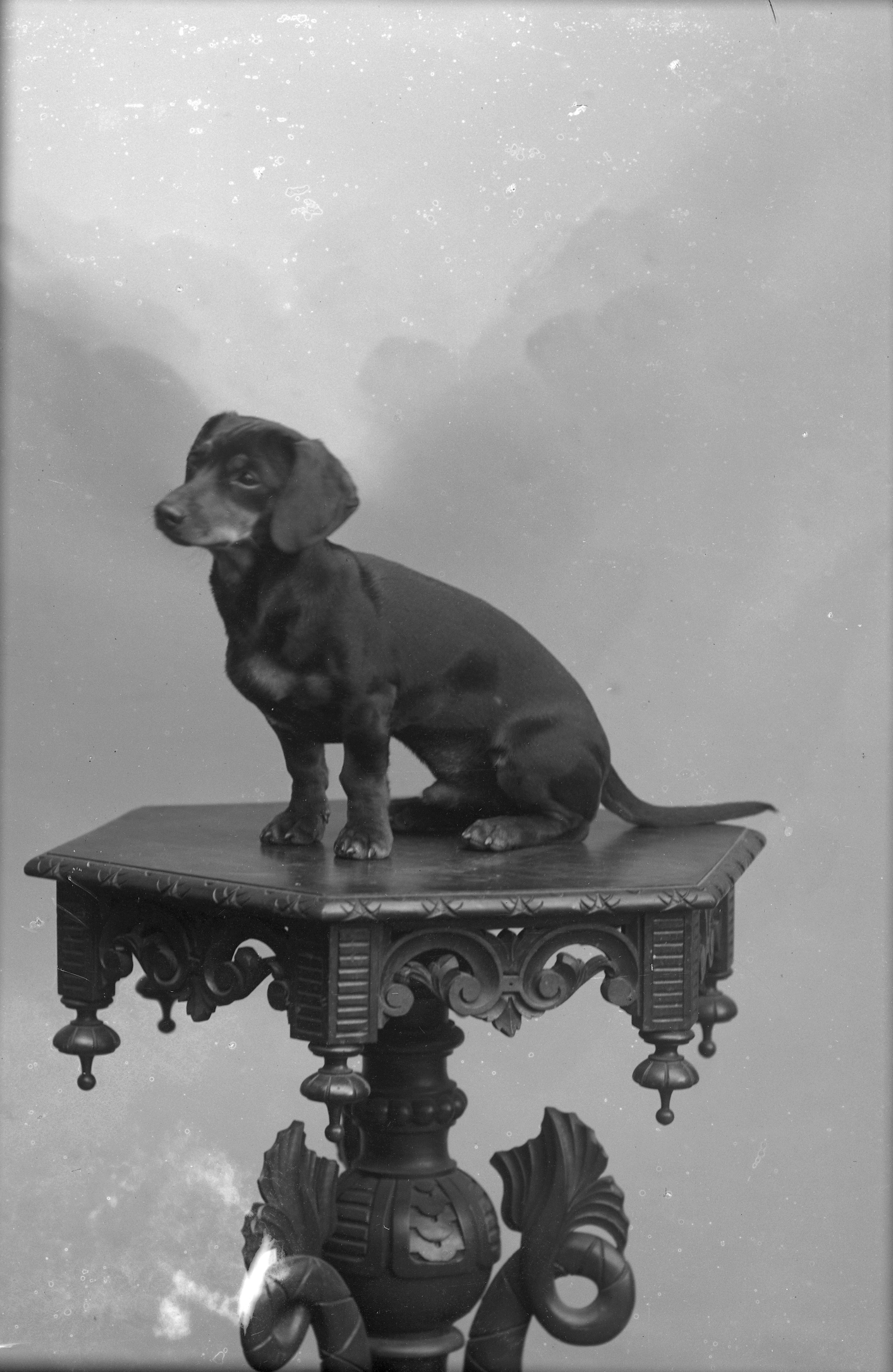 Porträtt av Diedens hund, sittande på bord.