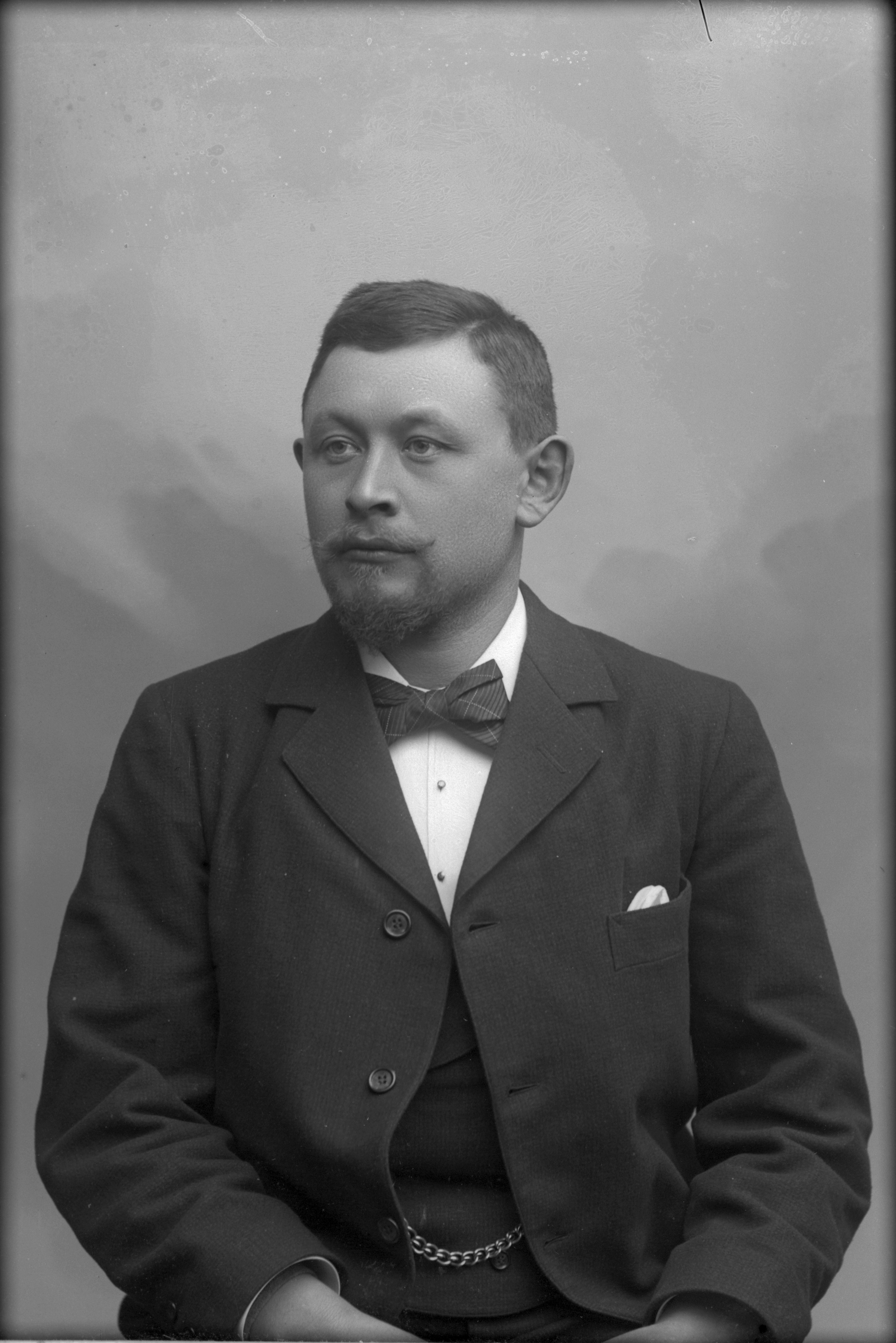 Beskrivning: Porträtt i halvfigur av August P. Persson.