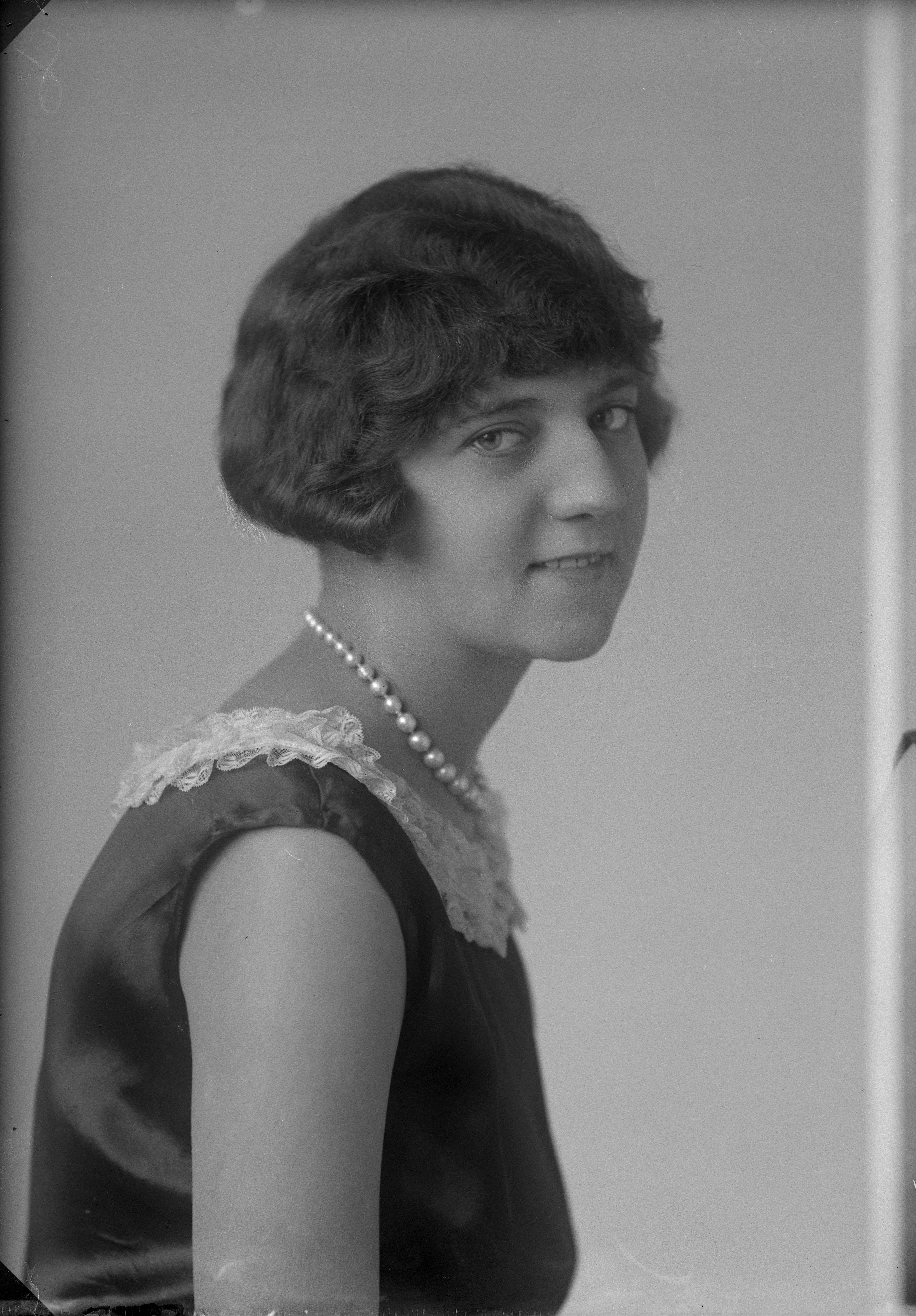 Beskrivning: Porträtt i halvfigur av Britta Wilson.