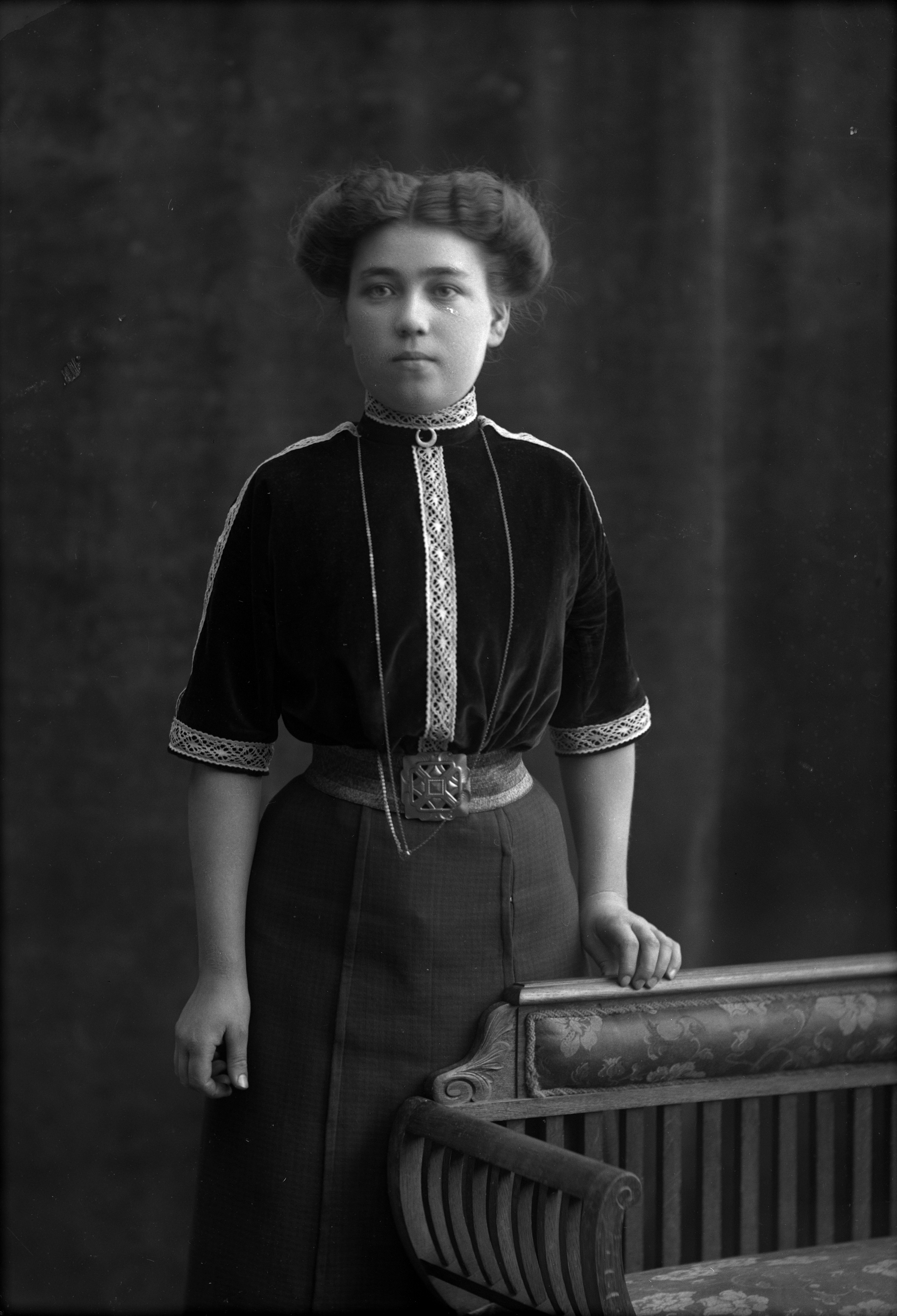 Porträtt i helfigur av Ida Johansson, stående vid soffa.