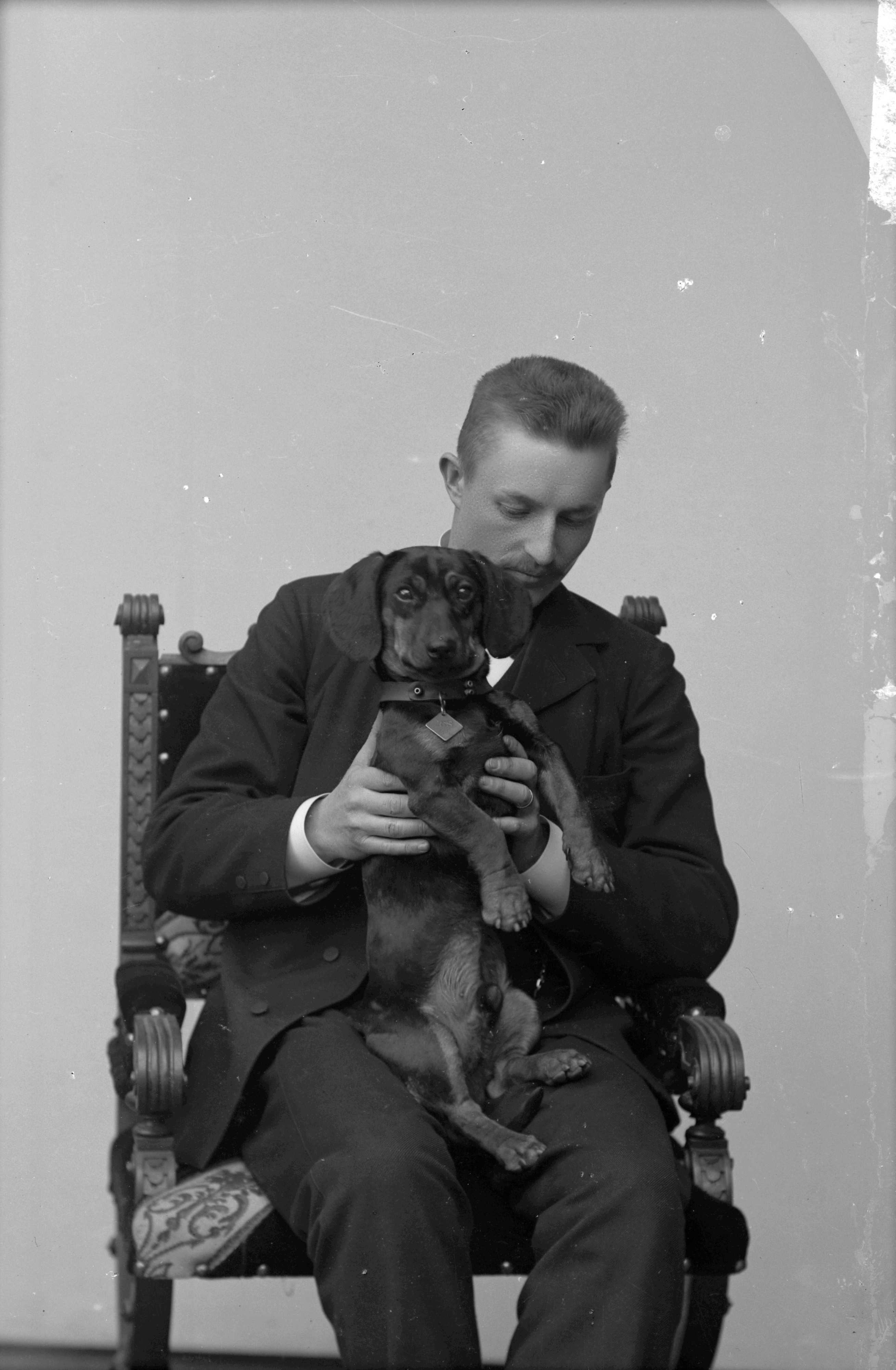 Porträtt i helfigur av ingenjören, linjedirektör Sven Otto Larsson Lennman, sittande med hund i knät.