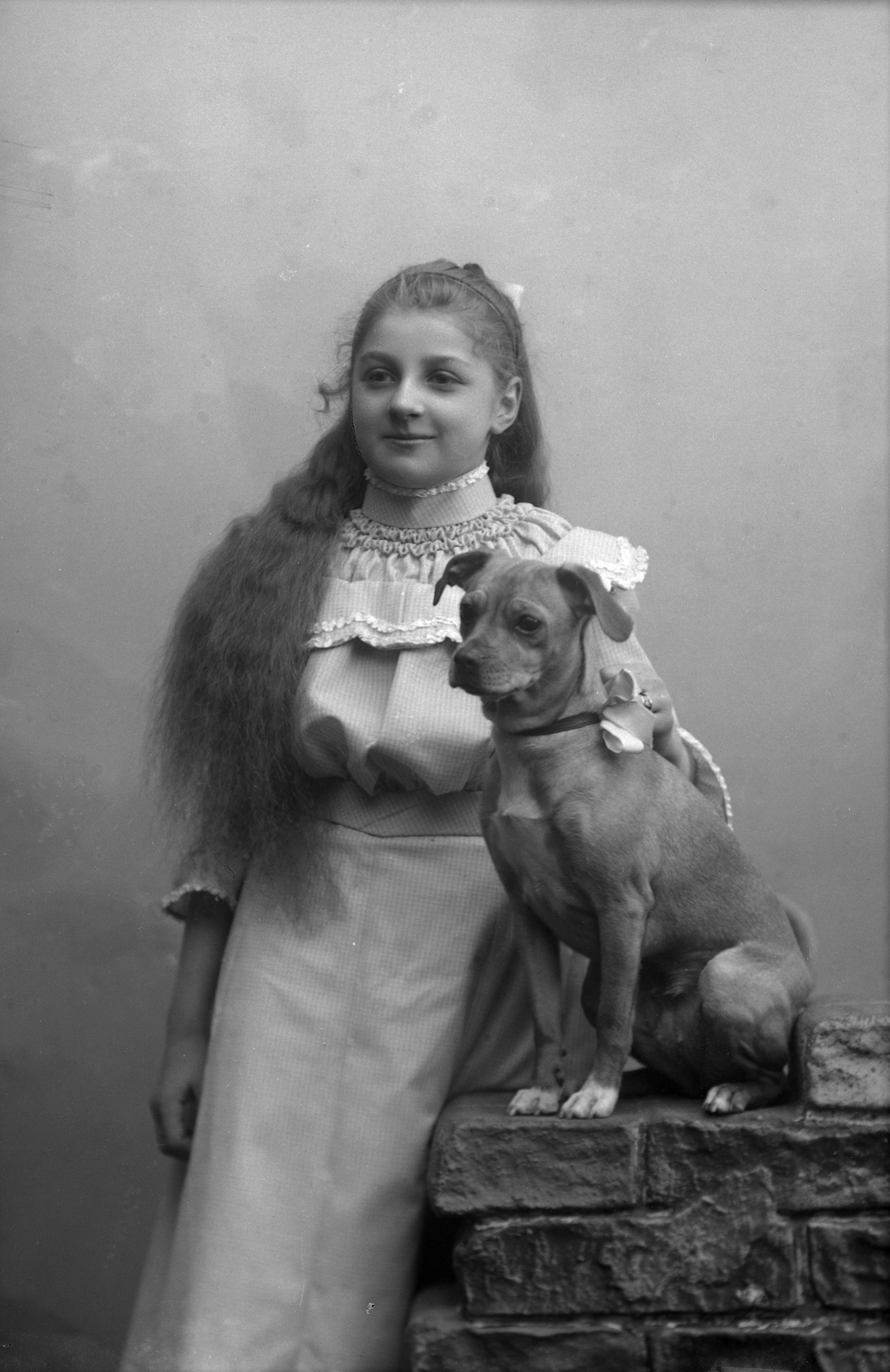 Porträtt i helfigur av Sara Andersson, stående vid stenmur, med hund.