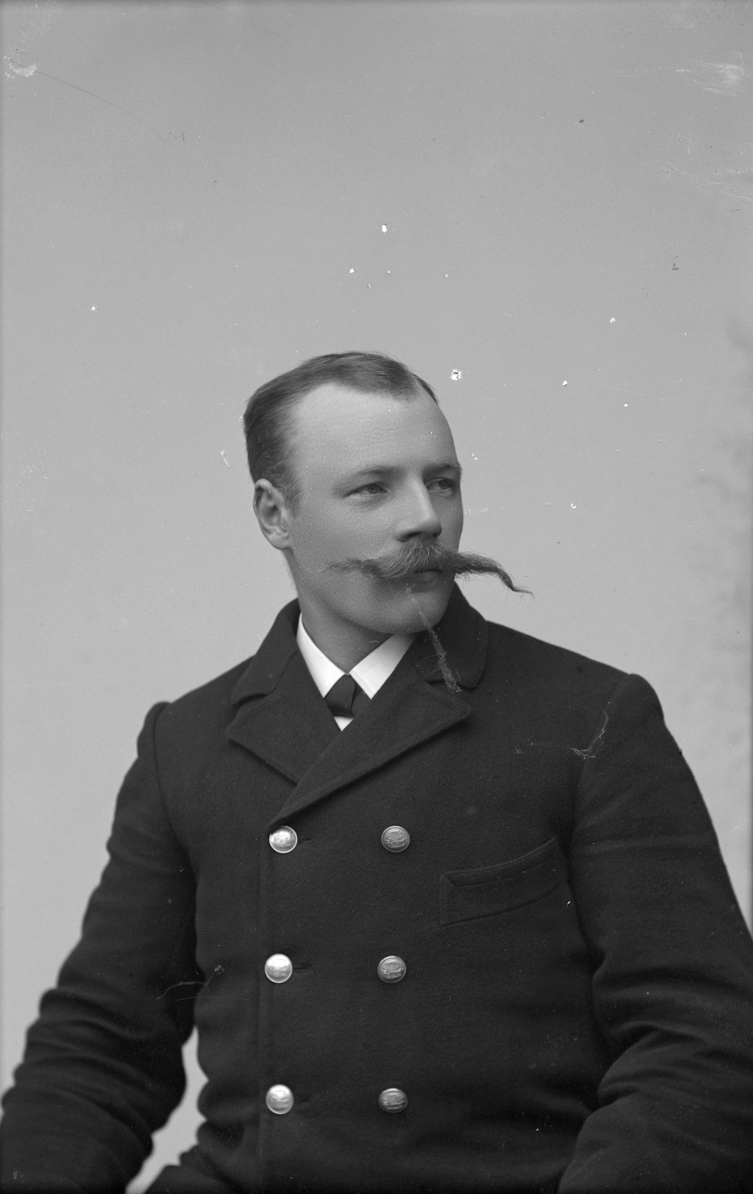 Beskrivning: Porträtt i halvfigur av stationskarl Carl Johan Selin.