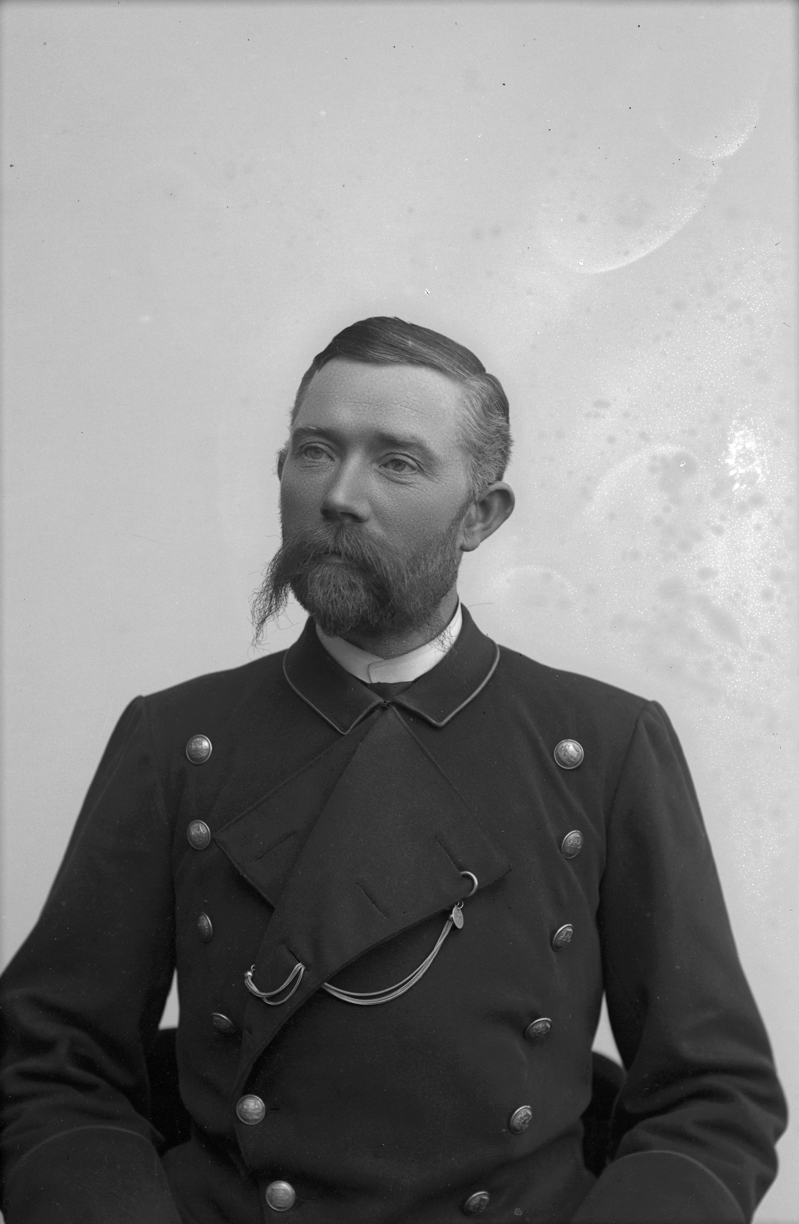 Porträtt i halvfigur av konduktör Karl Krantz, iklädd SJ-uniform.