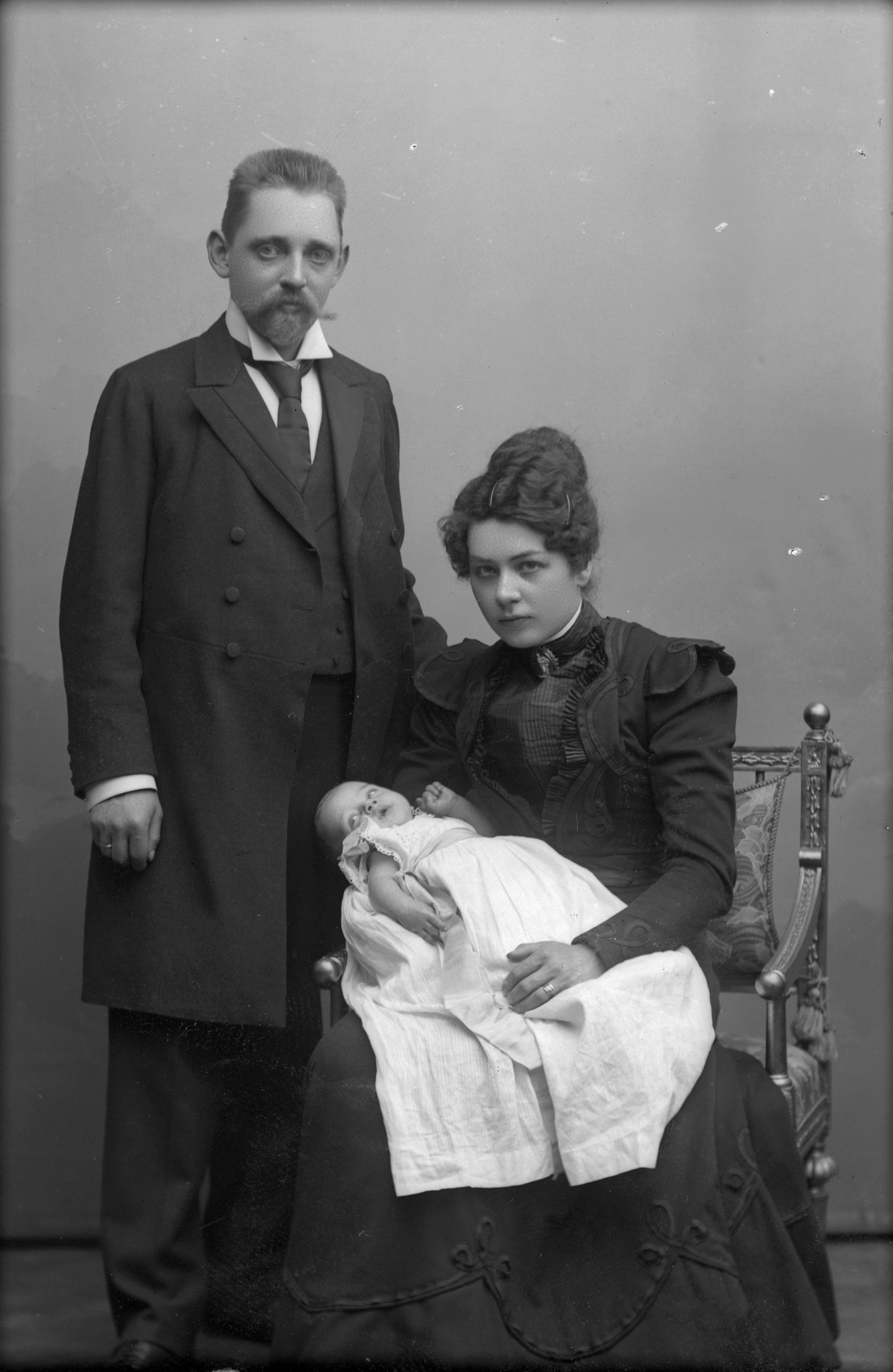 Porträtt i helfigur av herr Kjölstad med familj. Modern sittande med barnet, iklädd dopklänning, i knät.