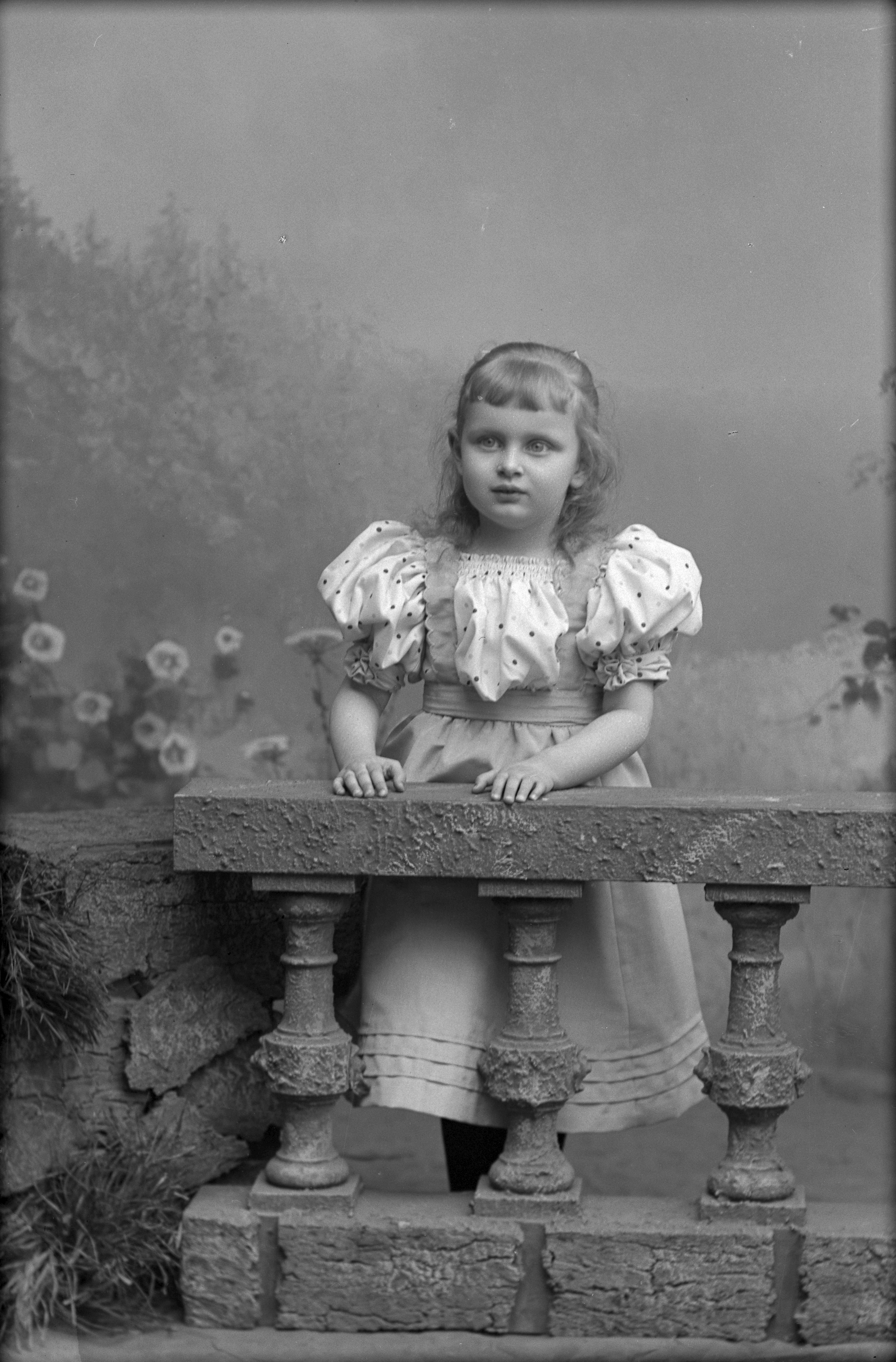 Porträtt i helfigur av Margareta von Essen, stående vid stenstaket med balustrad. Dotter till trafikchefen, järnvägsingenjör Reinhold von Essen (1848-1914).