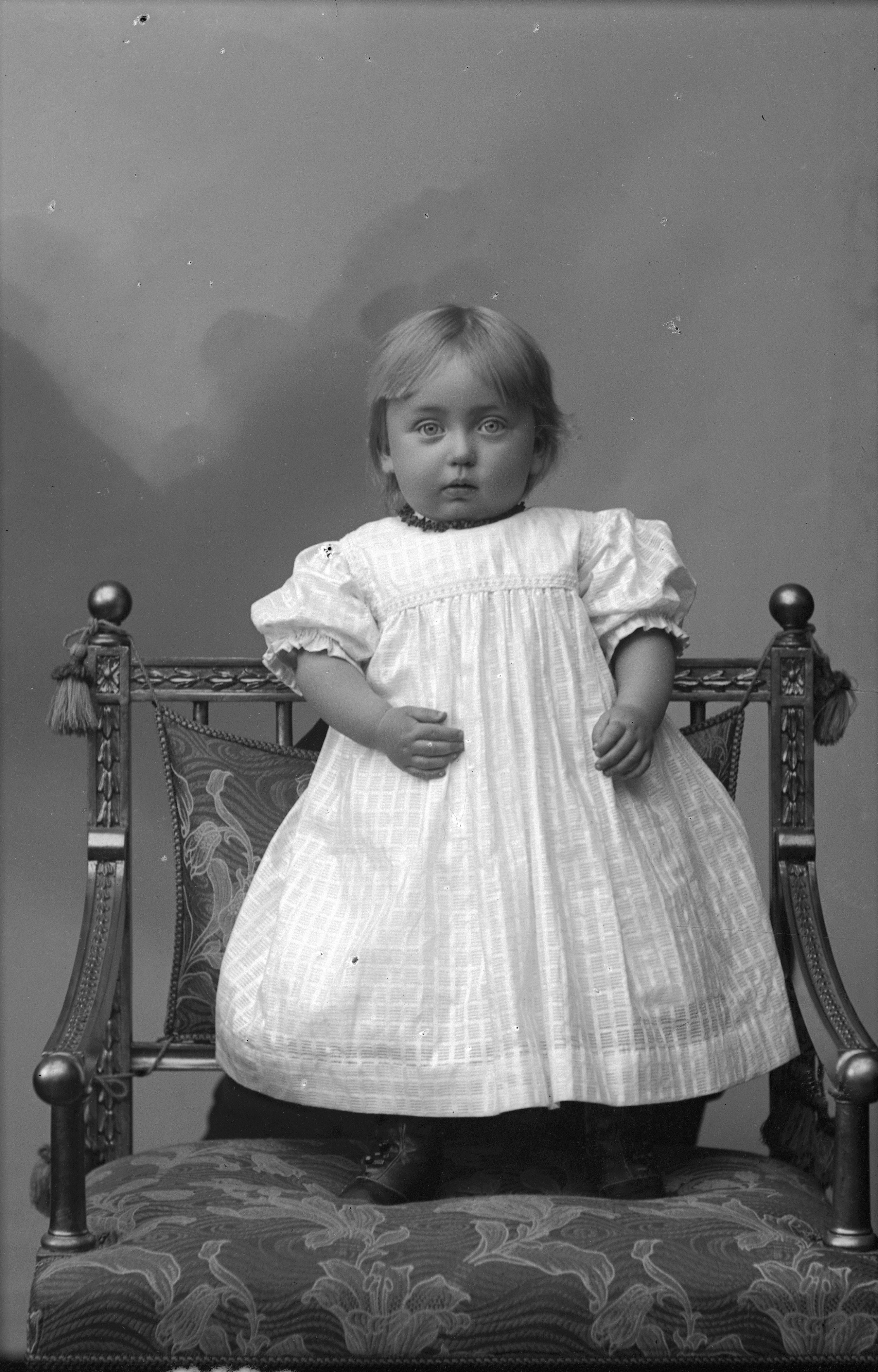 Porträtt i helfigur av fru von Siwers barn, stående på stol.