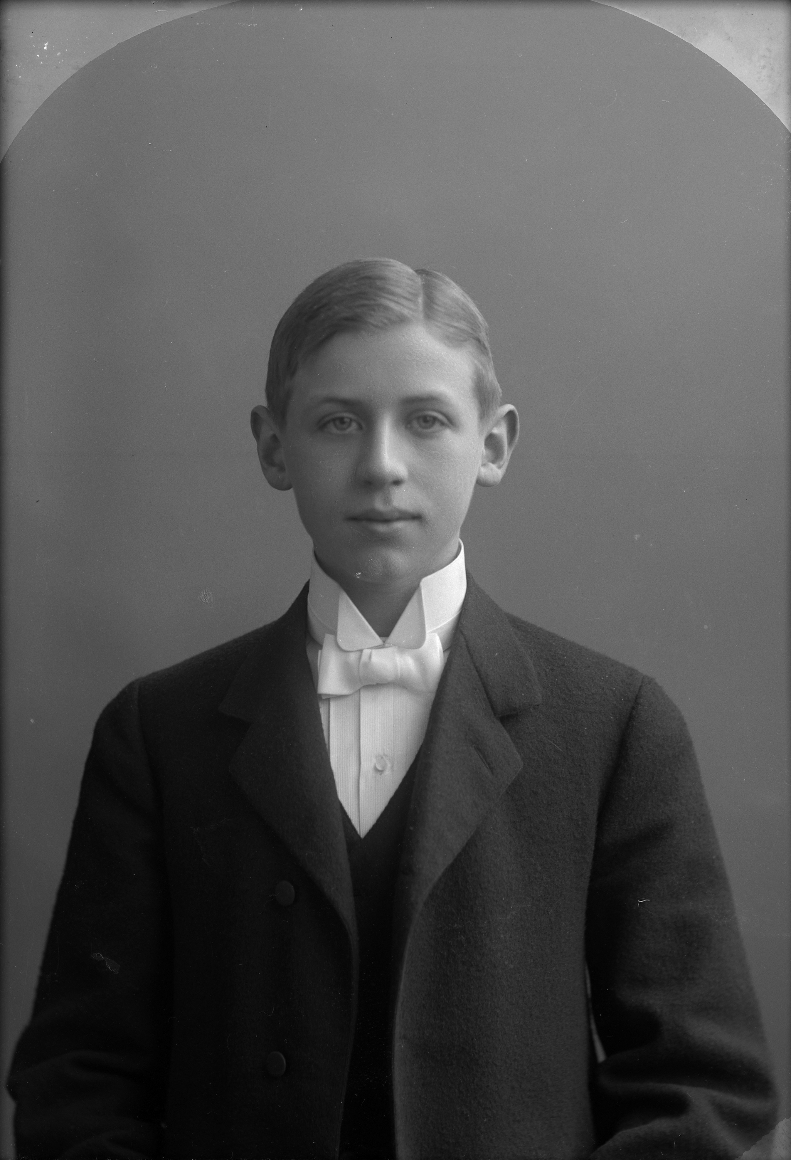 Beskrivning: Porträtt i halvfigur av konfirmanden Gösta Fågelskjöld.