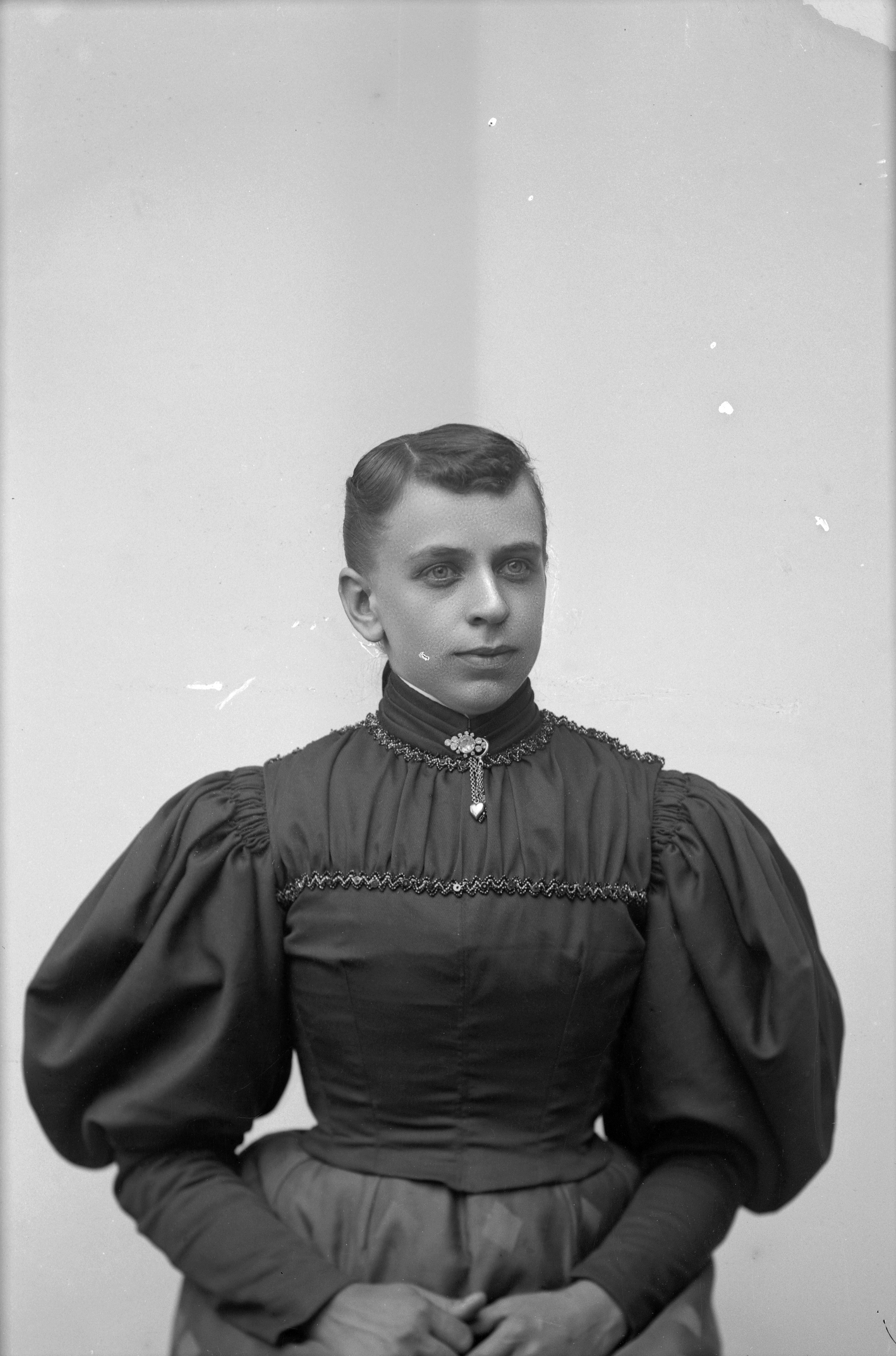 Beskrivning: Porträtt i halvfigur av Hilda Norbeck.