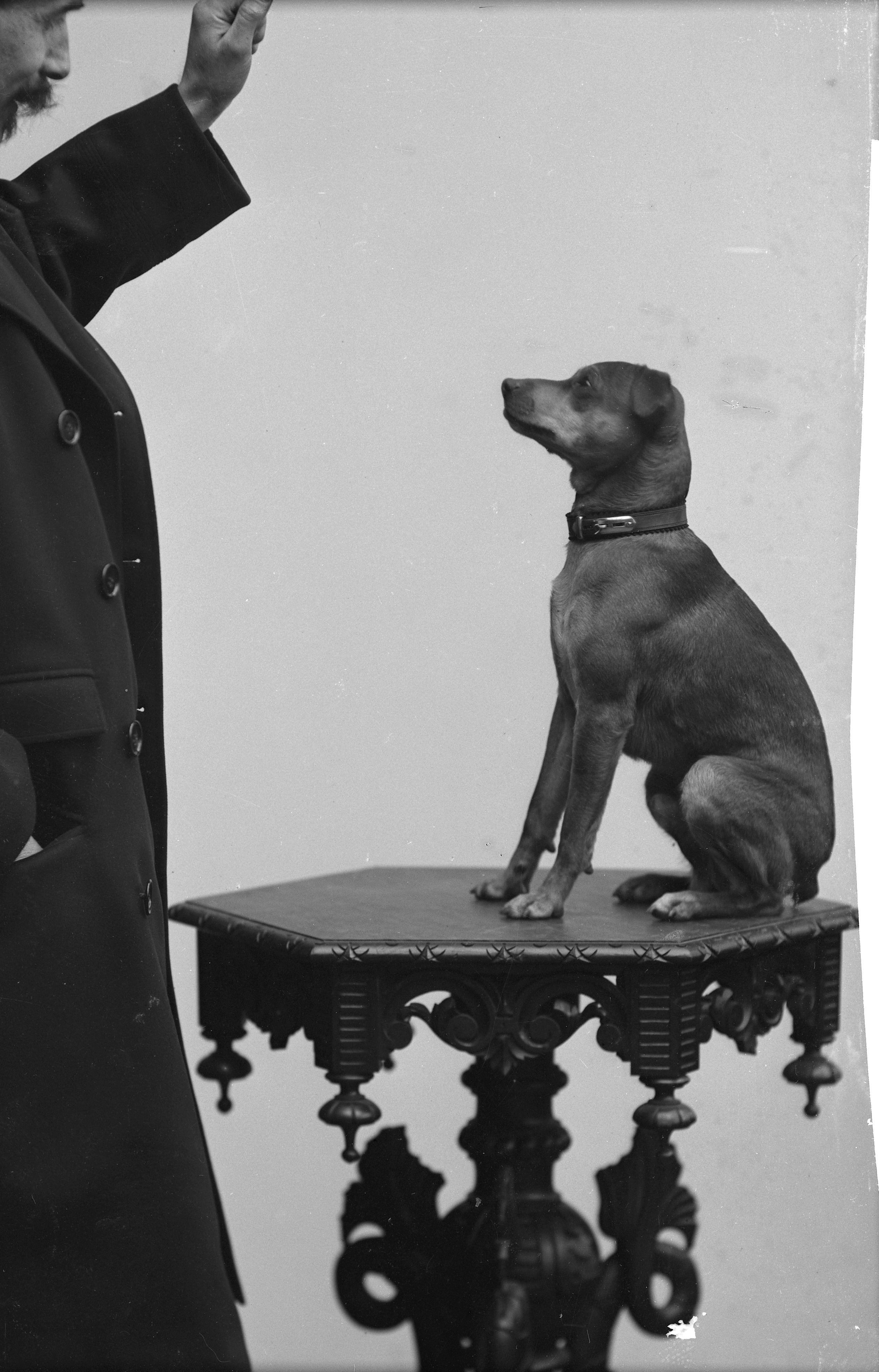 Porträtt av herr Liljegrens hund, sittande på bord.