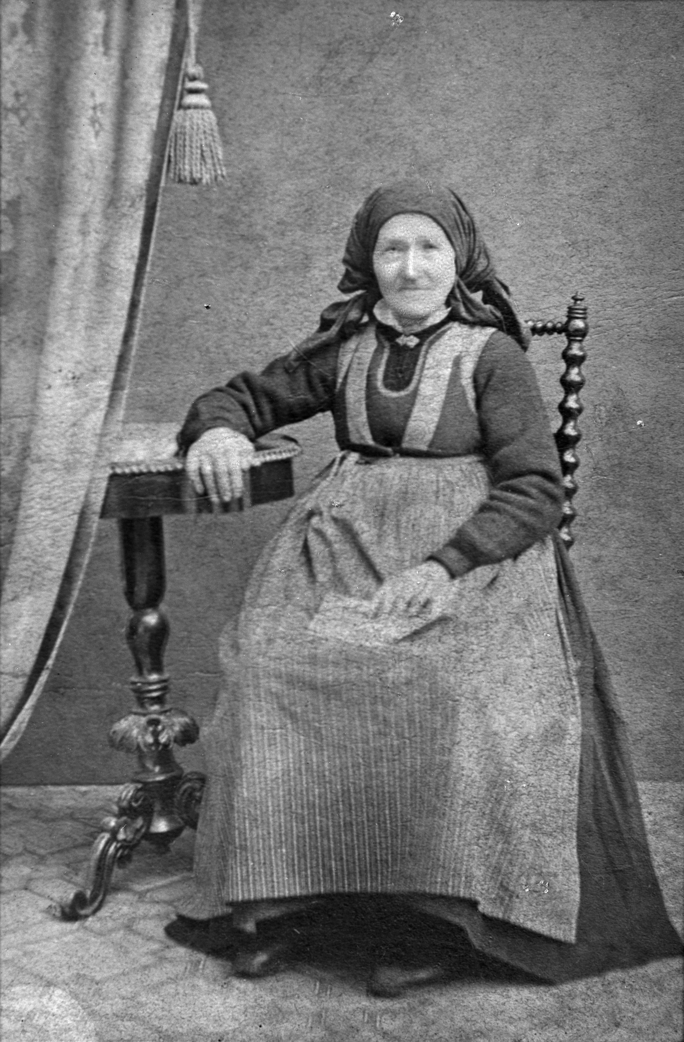 Porträtt i helfigur av oidentifierad kvinna, sittande vid bord.