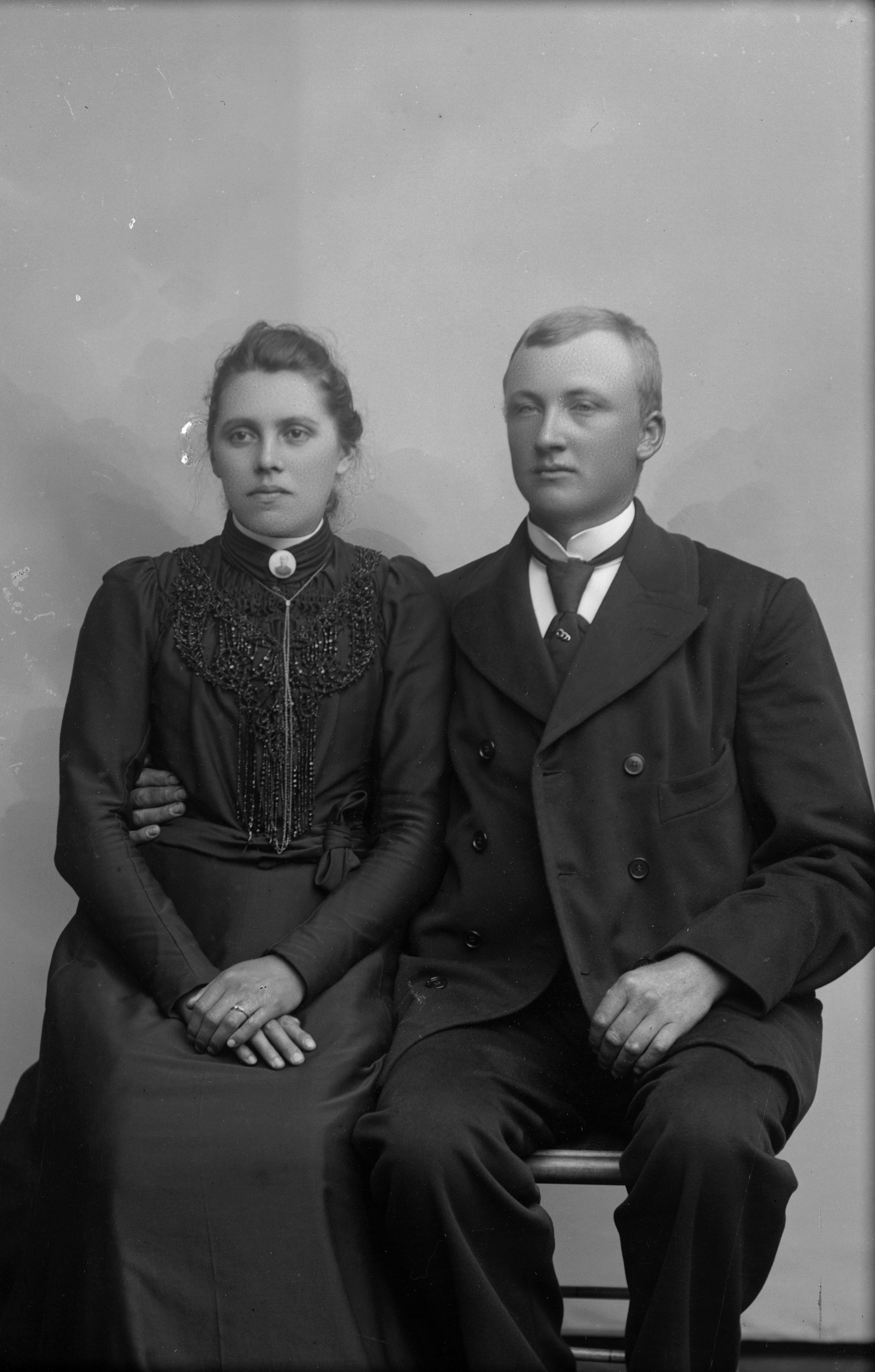 Beskrivning: Porträtt i helfigur av Augusta Nilsson med fästman.