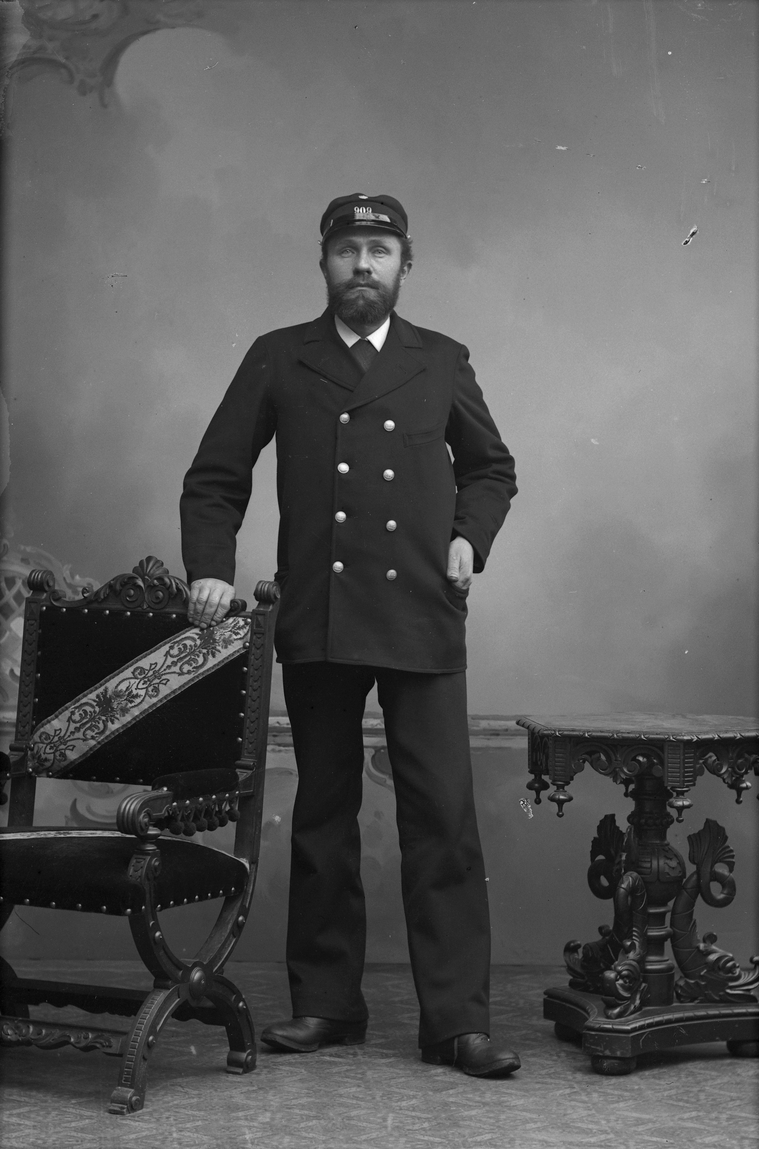 Porträtt i helfigur av stationskarl Lundgren, iklädd SJ-uniform, stående mellan bord och stol.