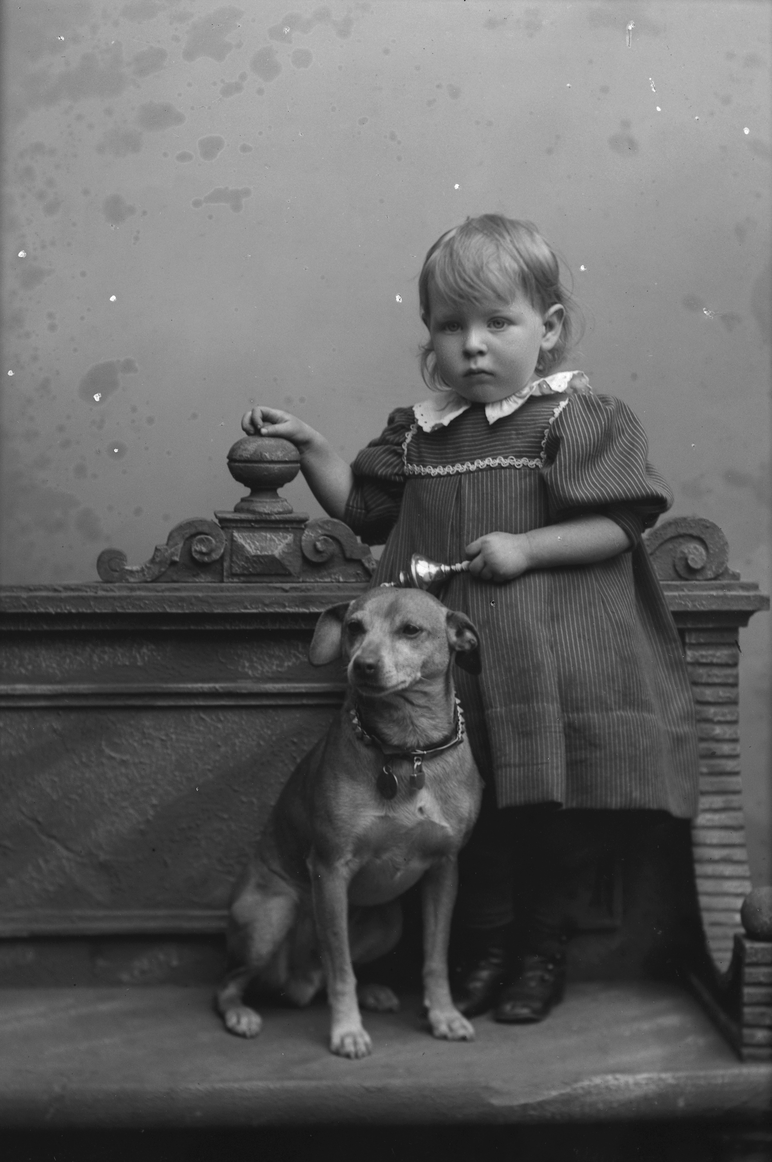 Porträtt i helfigur av herr Svenssons dotter, stående på bänk, med hund.